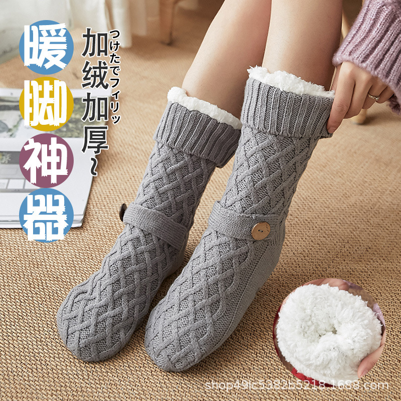 地板袜子女秋冬季中筒羊羔绒加绒加厚女士月子防滑特厚保暖睡眠袜