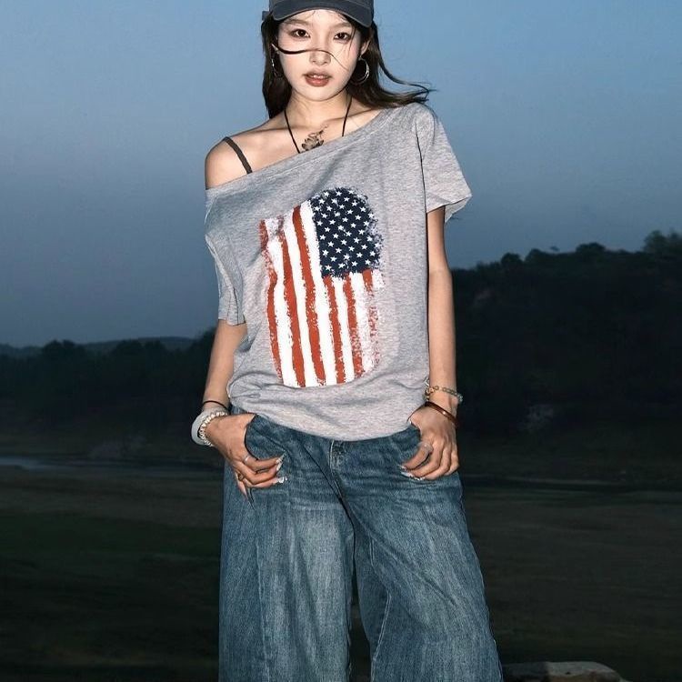 Tシャツカジュアル半袖プリントホットガールニッチホットスタンピンググラフィティサマーグレー春夏スラントカラールーズ万能トップ