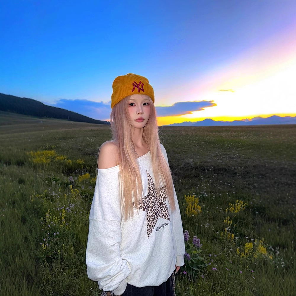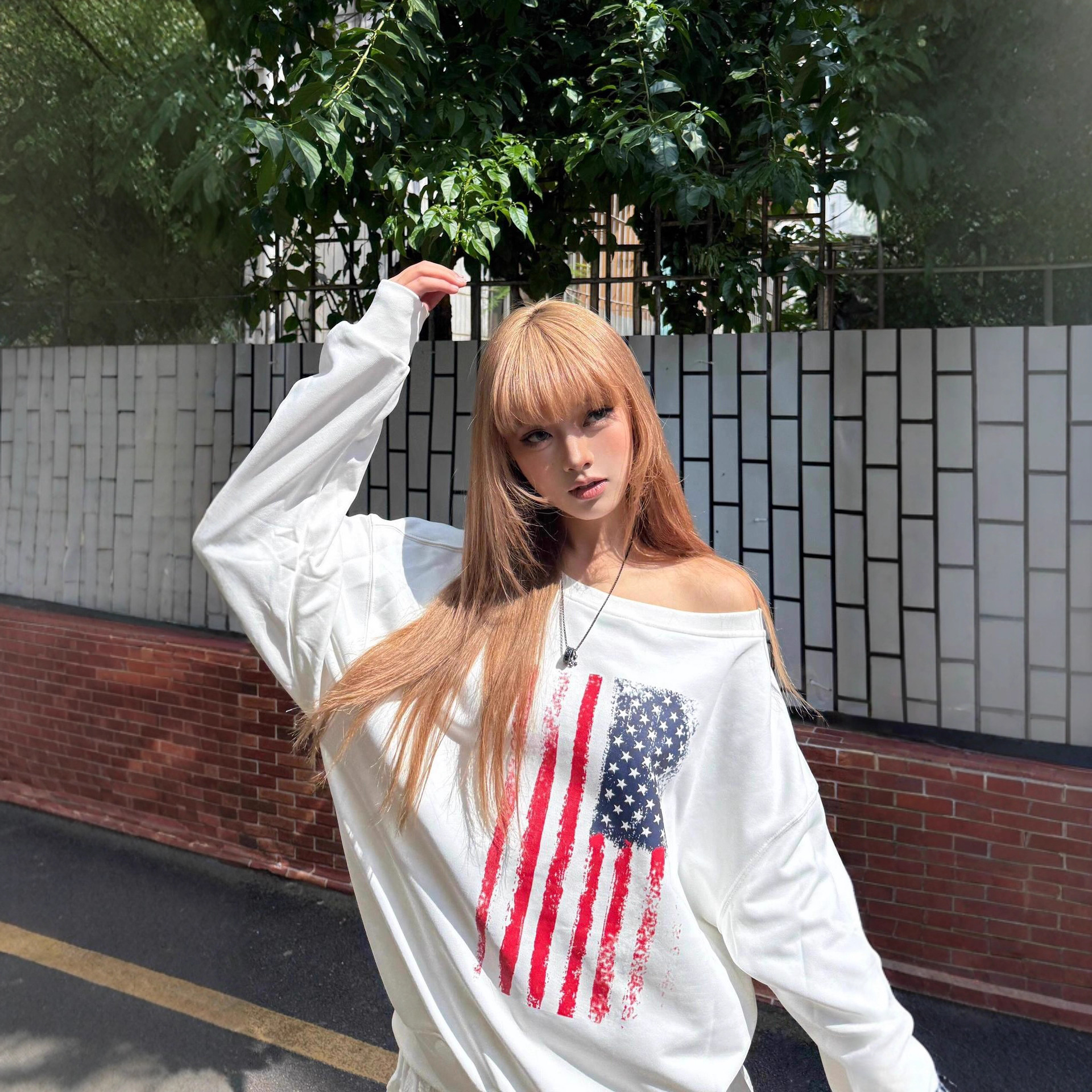 美式辣妹印花斜肩卫衣甜酷秋季2025新款宽松慵懒设计长袖露肩上衣