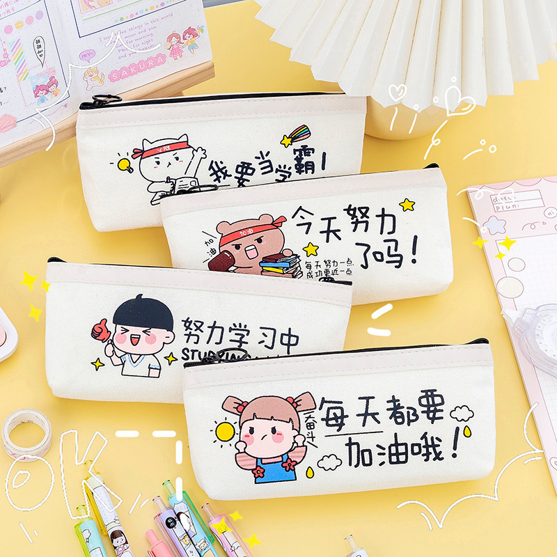 かわいい漫画の学生のキャンバスの筆の袋の励ましの志の文字の文房具の箱の日本の小さい清新な図案の鉛筆の袋の文房具の袋