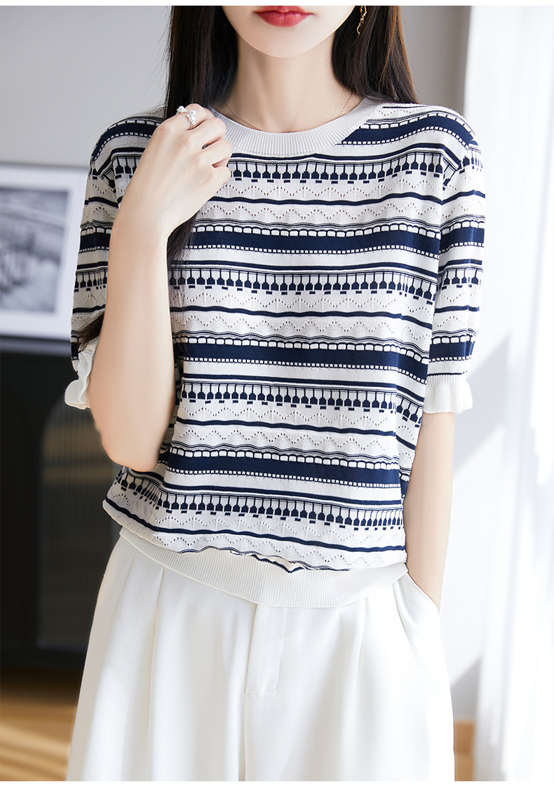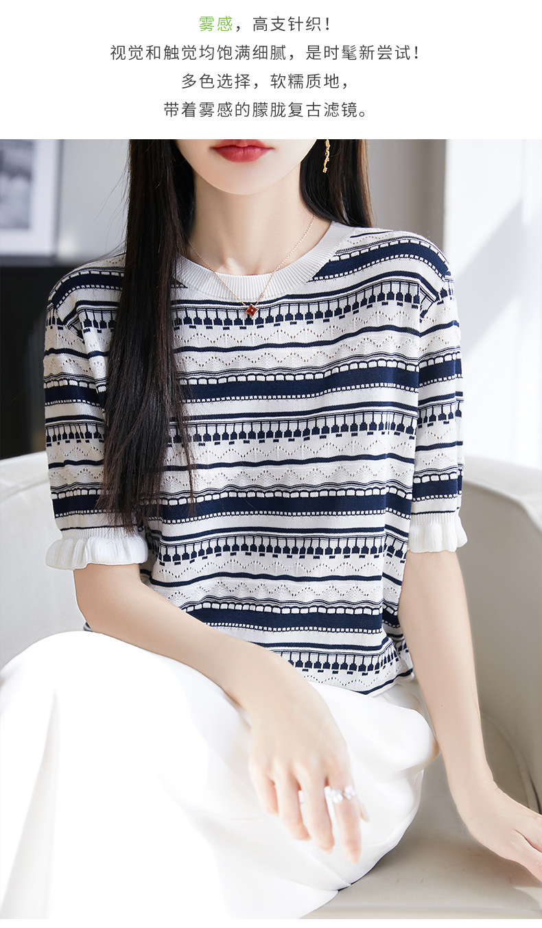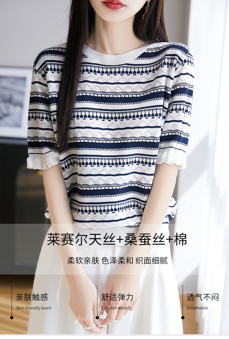 波紋ジャカードニットシルクのライゼルの清涼なハスの葉の縁の丸首のニットの半袖のtシャツの女性の上着