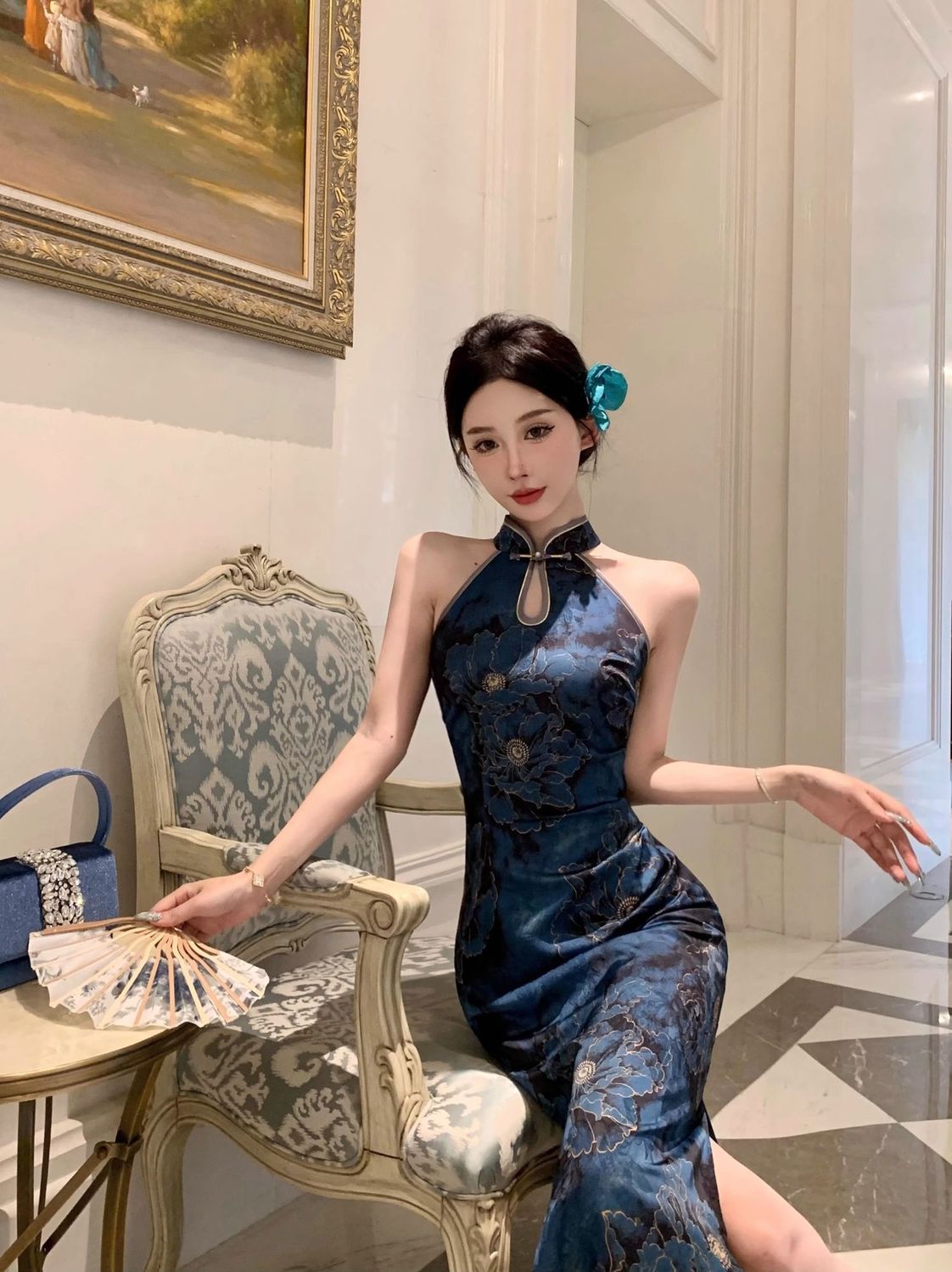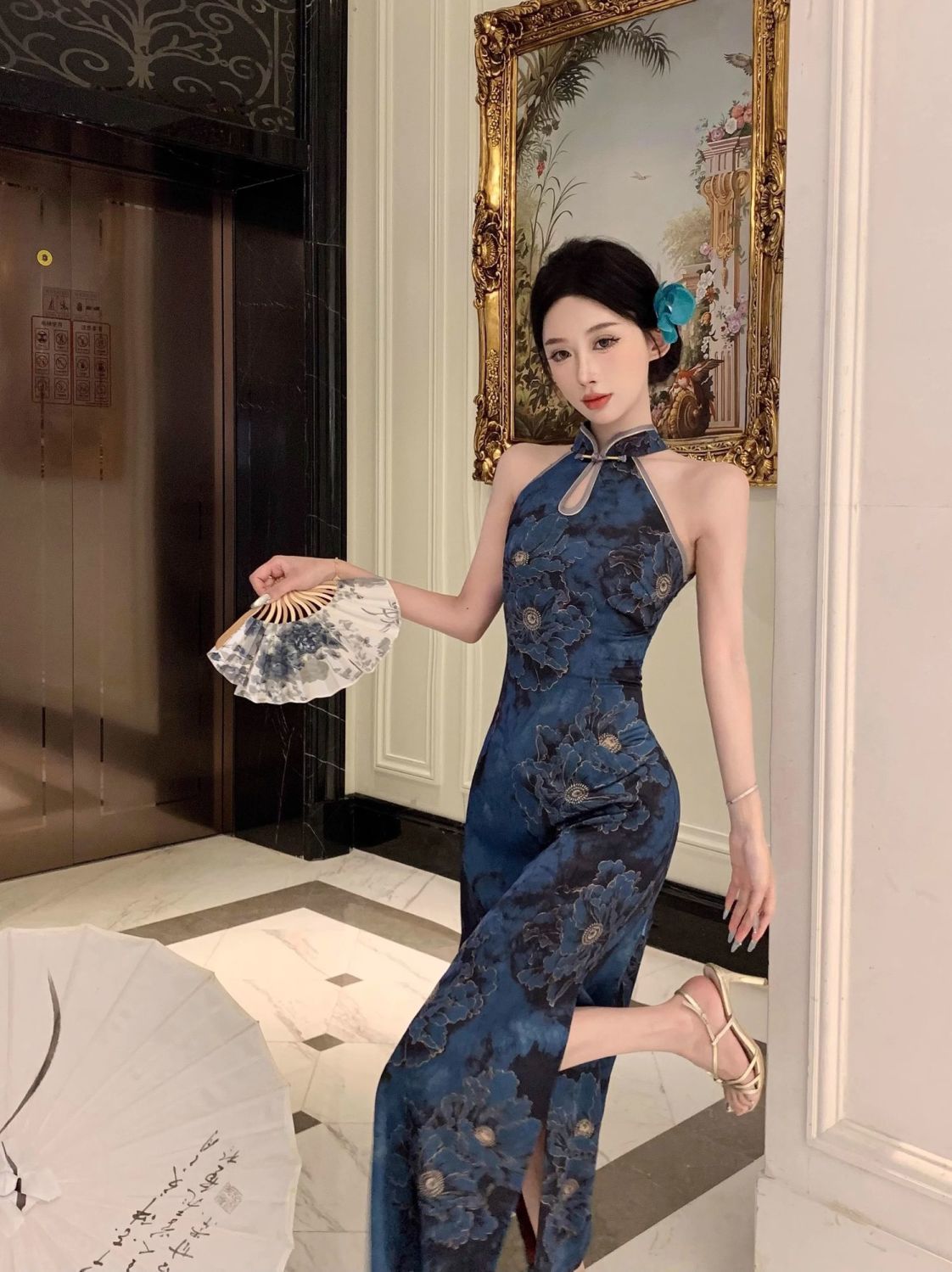 新中国式の名媛の優雅なレトロなプリントはフォークを開けてチャイナドレスのワンピースを改良します。