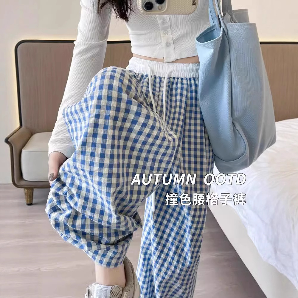 格子の広腿のズボンの女性の2025夏の新型の怠惰なデザイン感のズボンのゆったりしたカジュアルなストレート感のモップのズボン