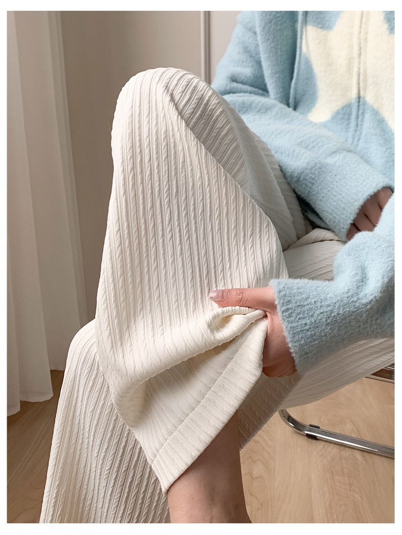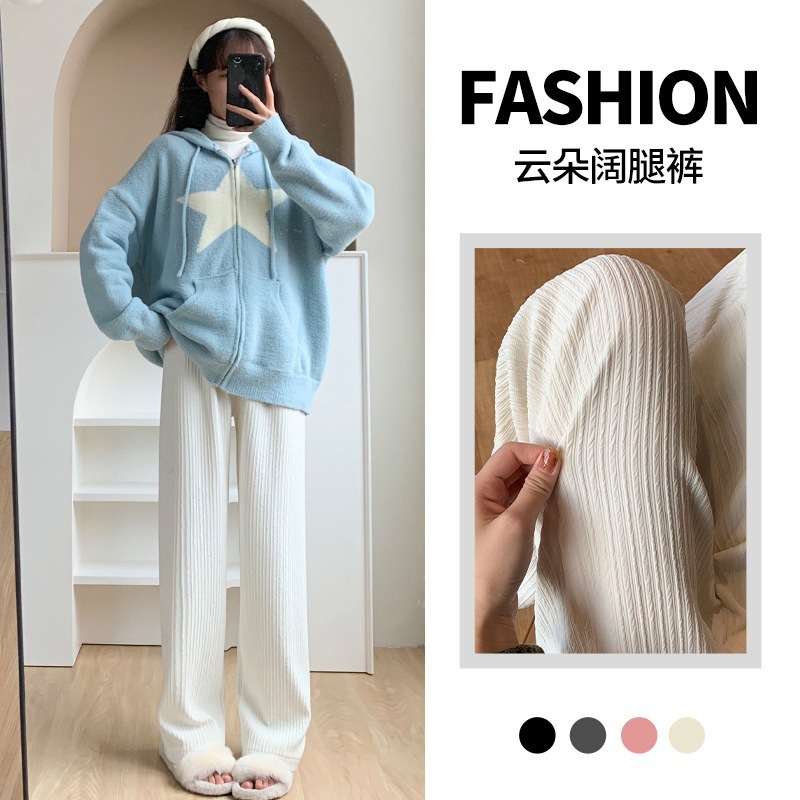 人気の7色ニットクラウドワイドレッグパンツレディース春夏ハイウエストドレーププリーツストレートカジュアルフロアレングスパンツ