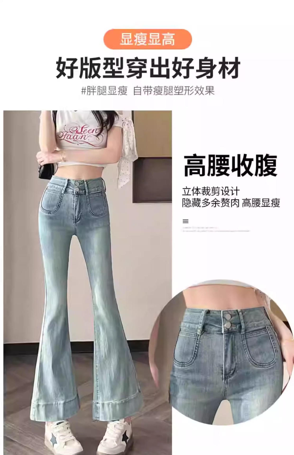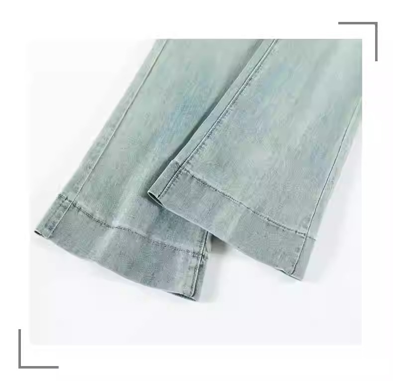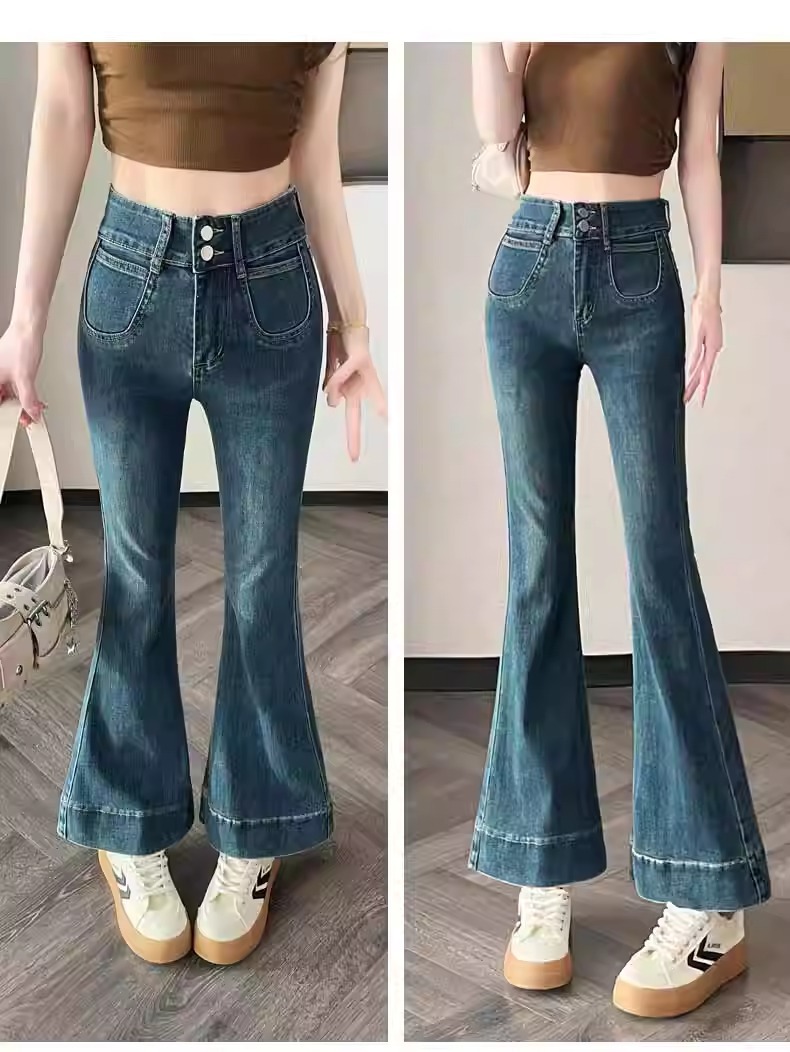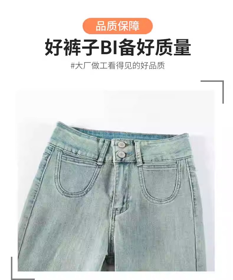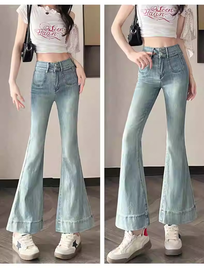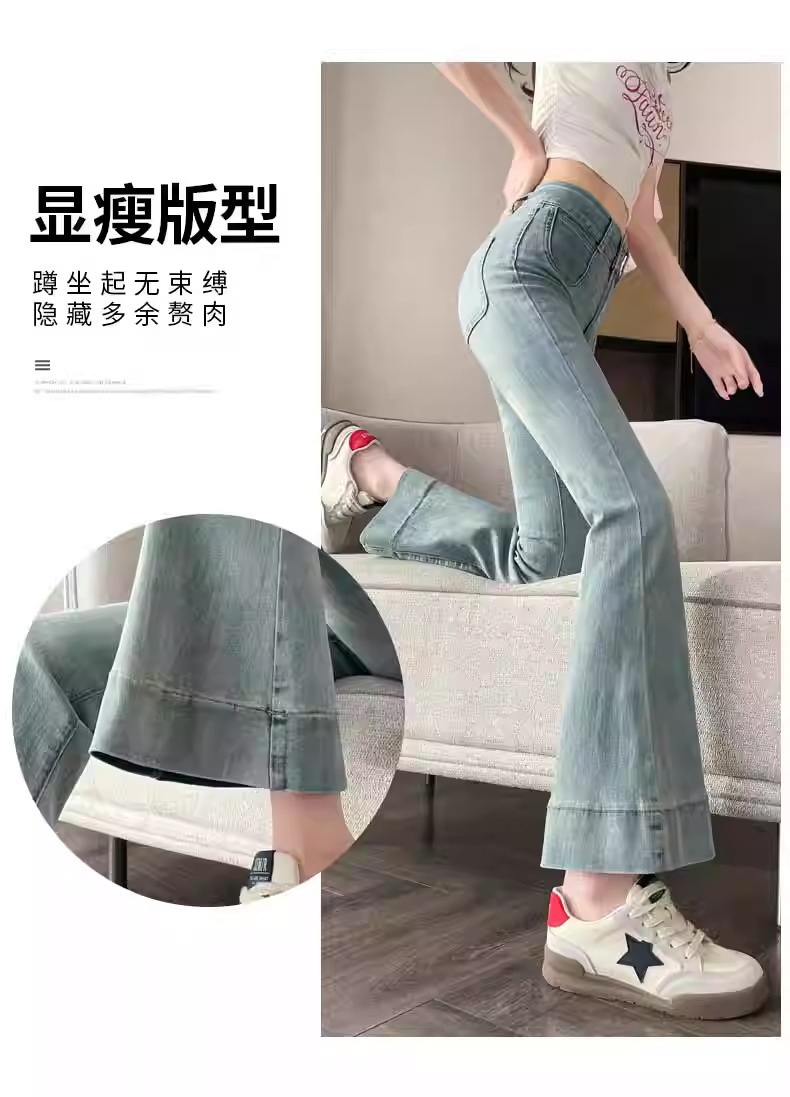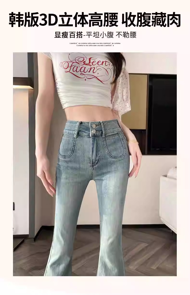 レトロなマイクロラップジーンズの女性2025夏の薄いタイプの高腰修身の小さい背は腹を収めて広い足の馬蹄のトランペットのズボンを収めます。