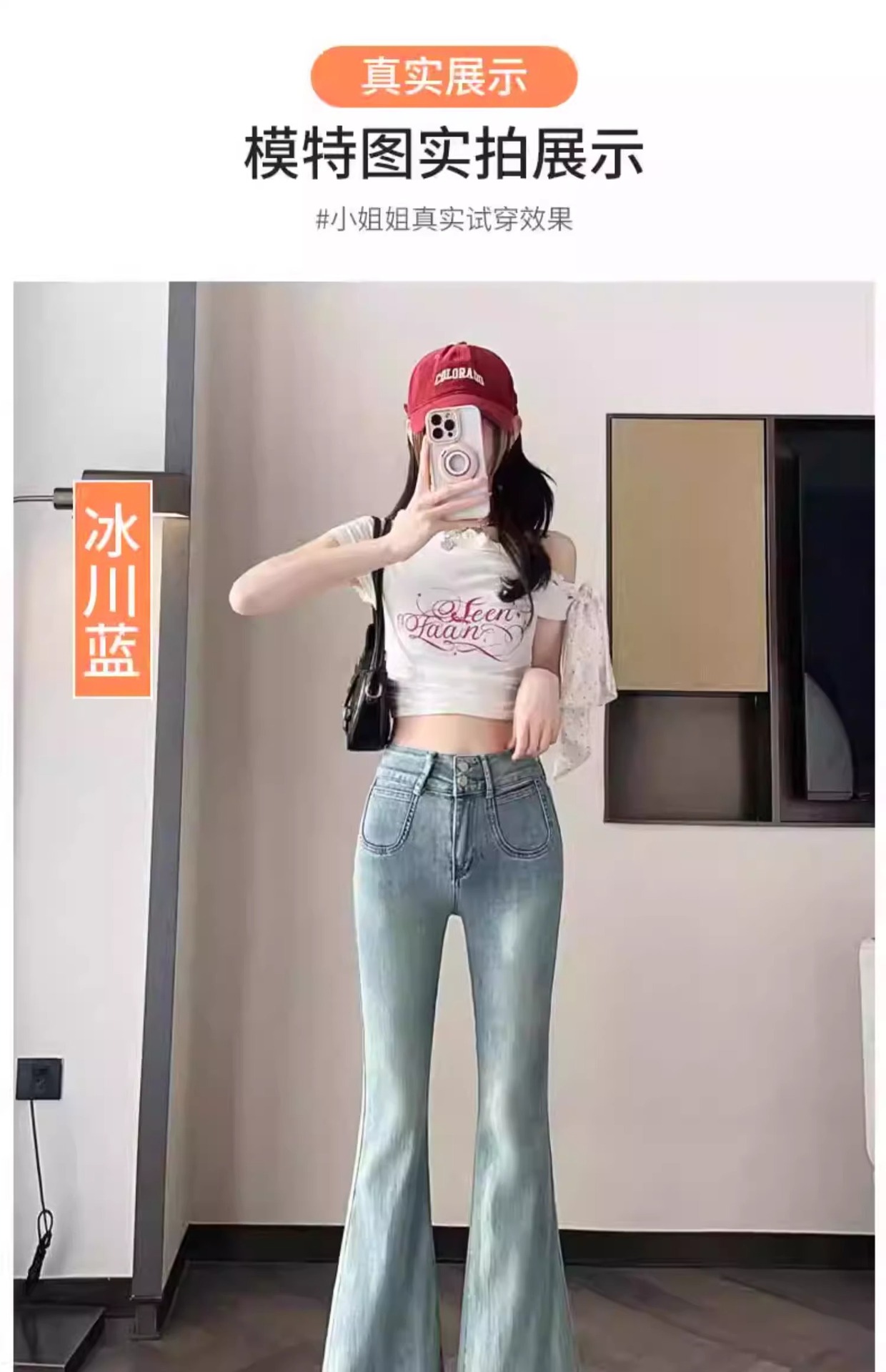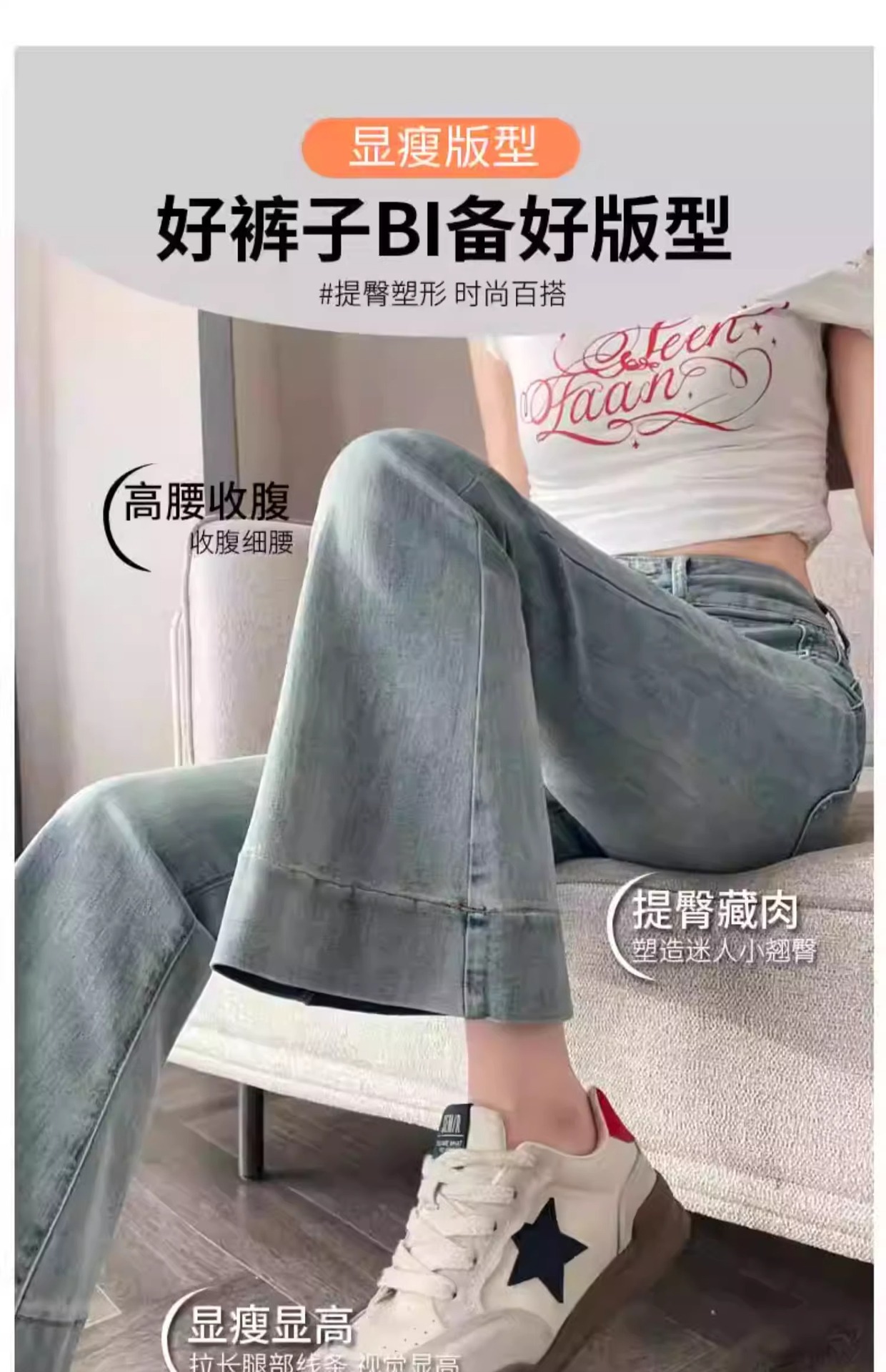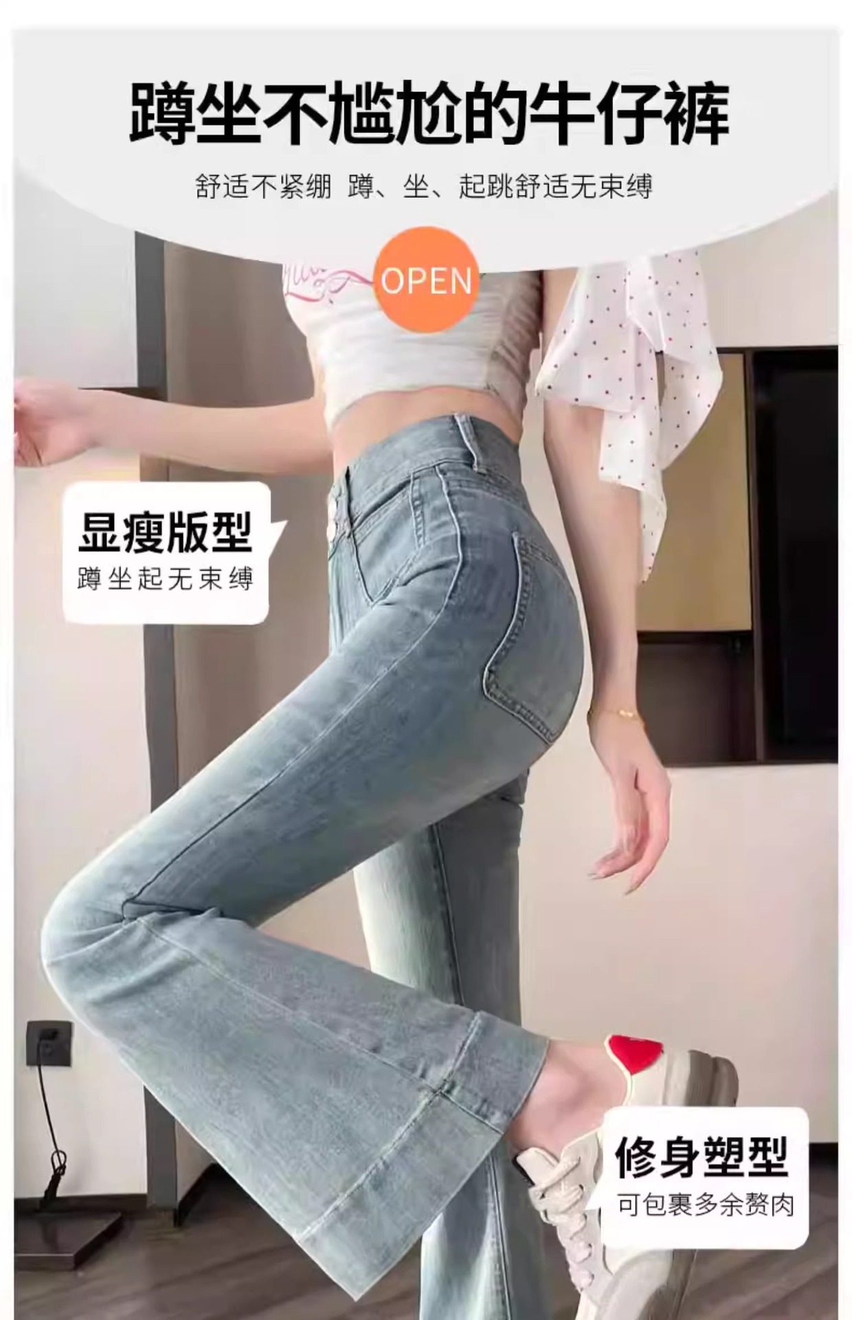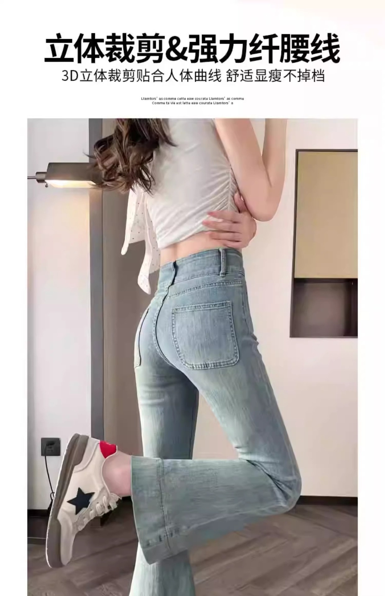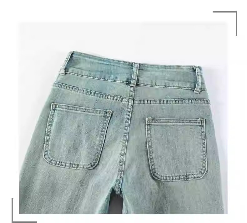 レトロなマイクロラップジーンズの女性2025夏の薄いタイプの高腰修身の小さい背は腹を収めて広い足の馬蹄のトランペットのズボンを収めます。