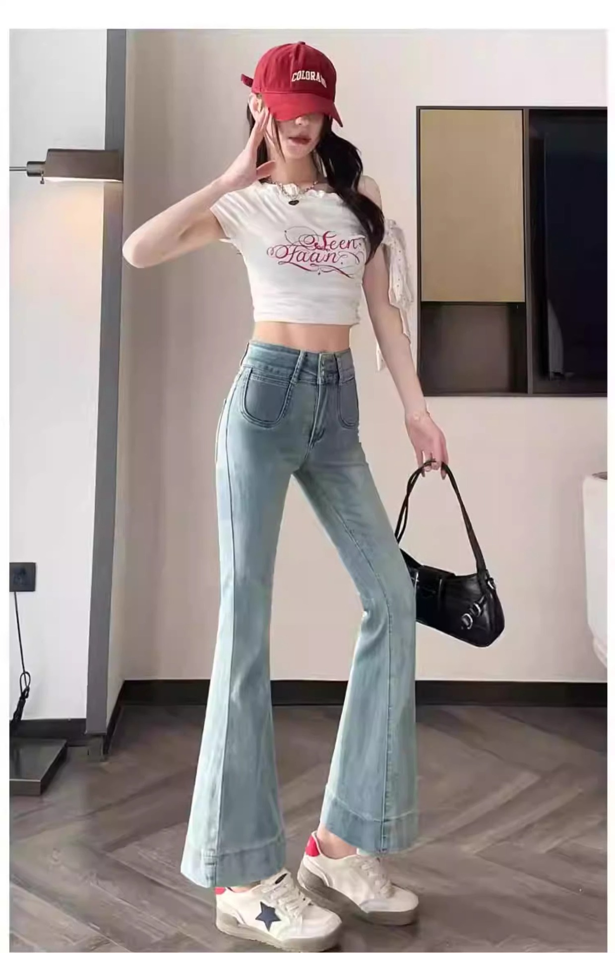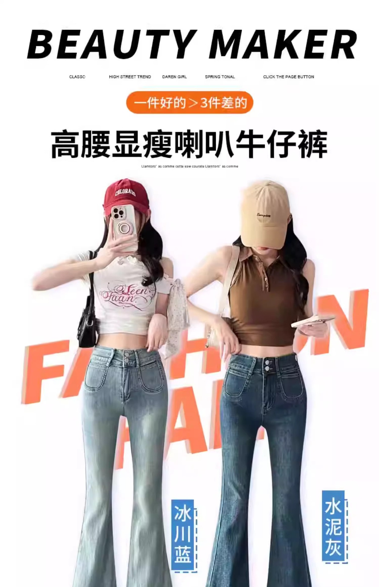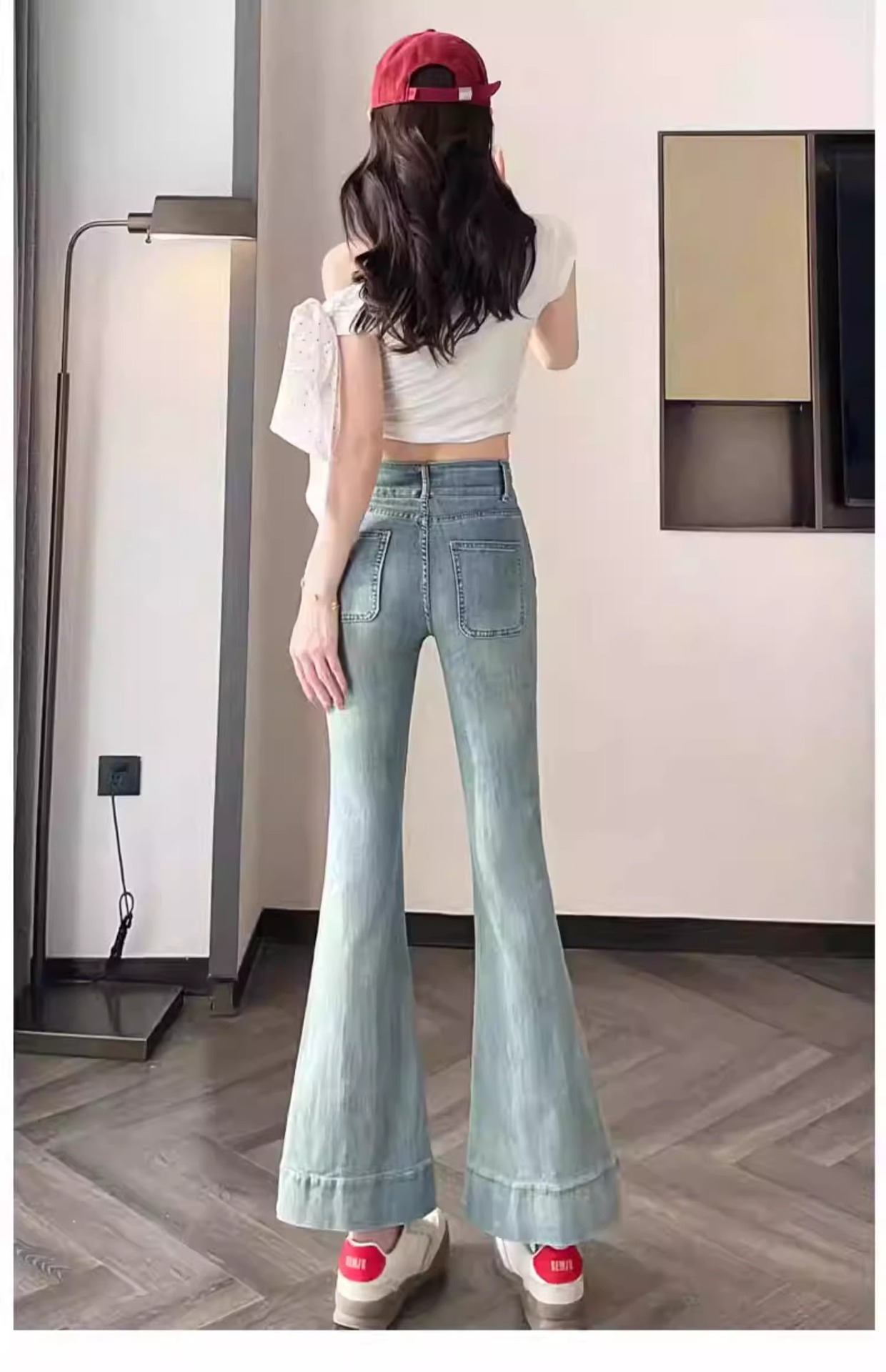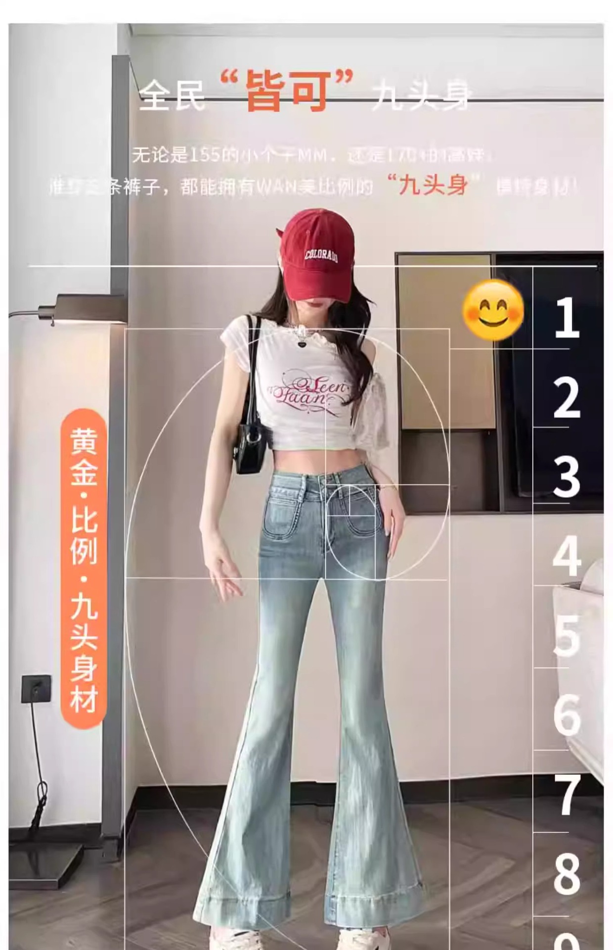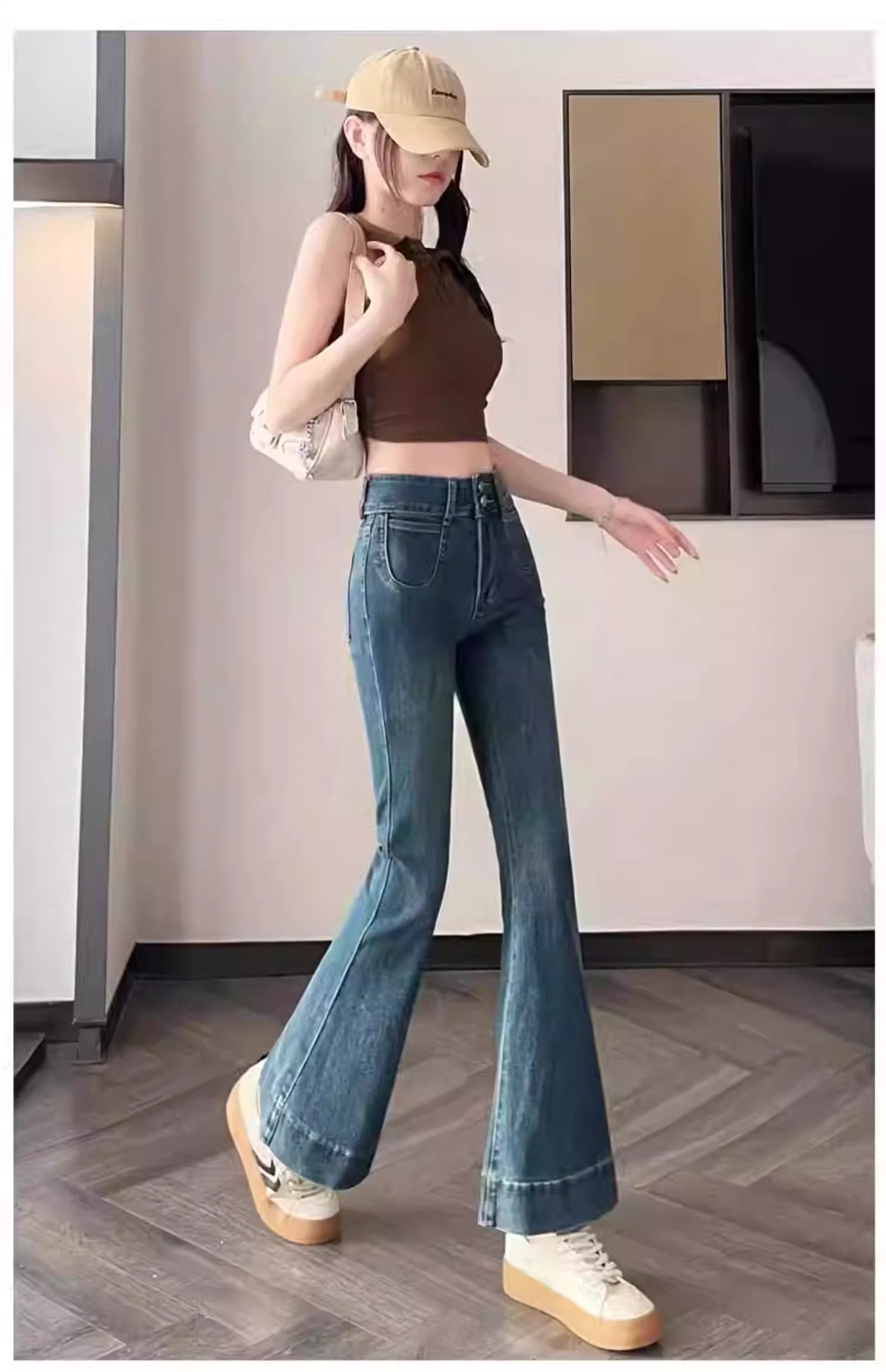 レトロなマイクロラップジーンズの女性2025夏の薄いタイプの高腰修身の小さい背は腹を収めて広い足の馬蹄のトランペットのズボンを収めます。