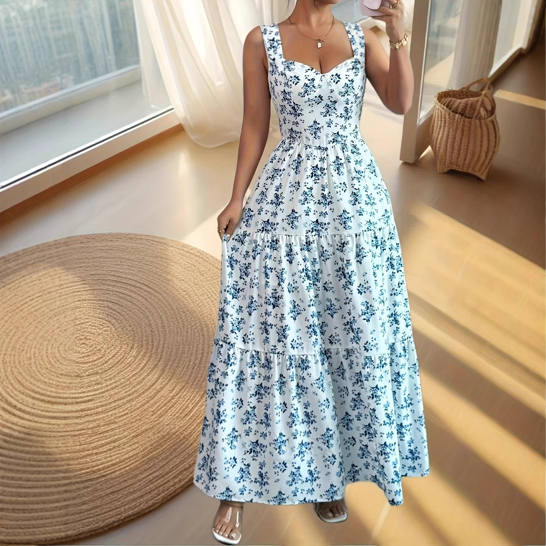 ヨーロッパとアメリカの貿易クロスボーダー新しい女性のファッションエレガントなウエスト海辺の休暇花柄ロングスカート