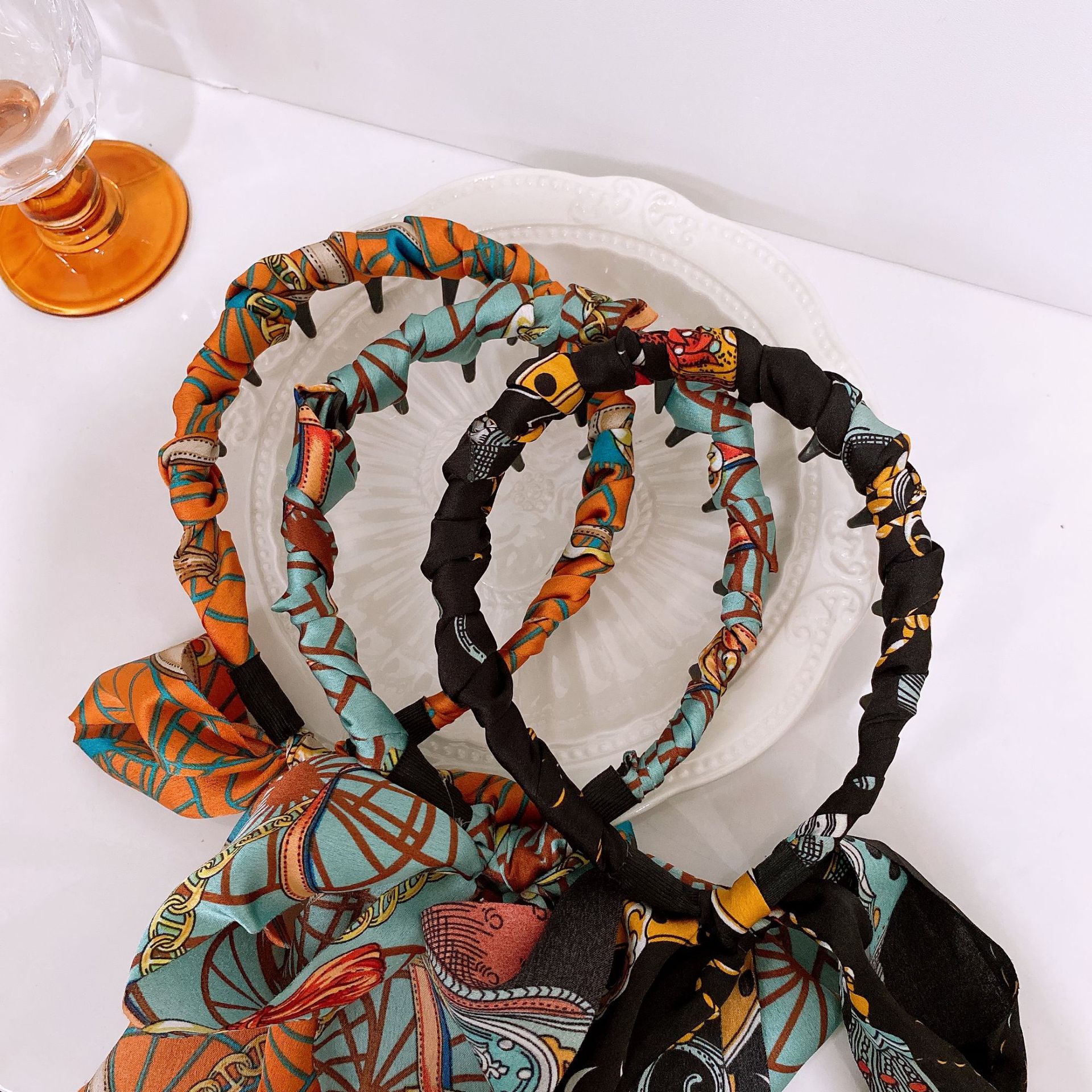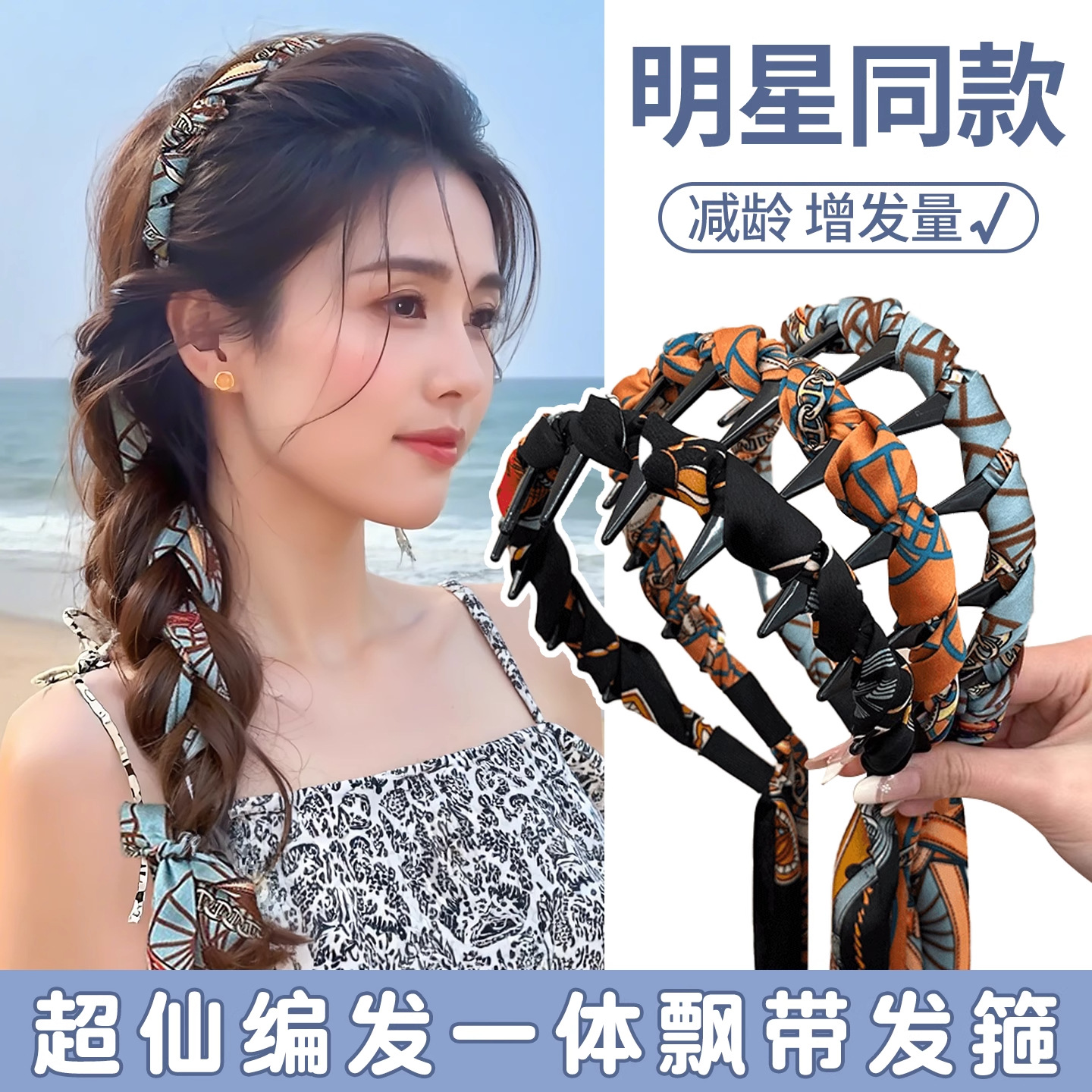 少女牛仔蓝波飘带新款夏日清凉麻花纽结甜辣全扎齿梳飘带发箍头箍