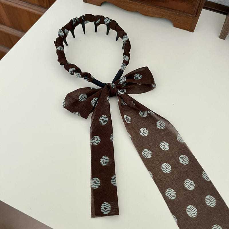 女性用茶色の水玉模様のリボンヘッドバンド、顔を洗うためのリバーシブルヘッドバンド、ポニーテールヘアピンヘッドバンド
