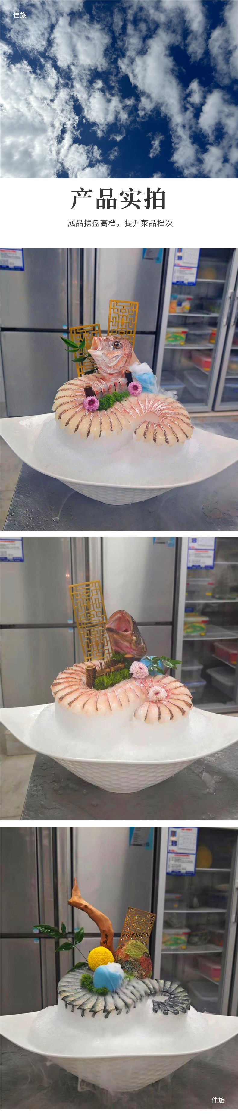 身を刺して皿の金型の雪の牛肉の寿司のサーモンの海鮮の姿を並べて皿を飾って大根の輪の氷の彫刻の砥石を飾ります。