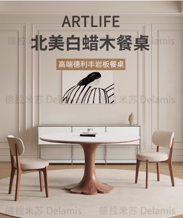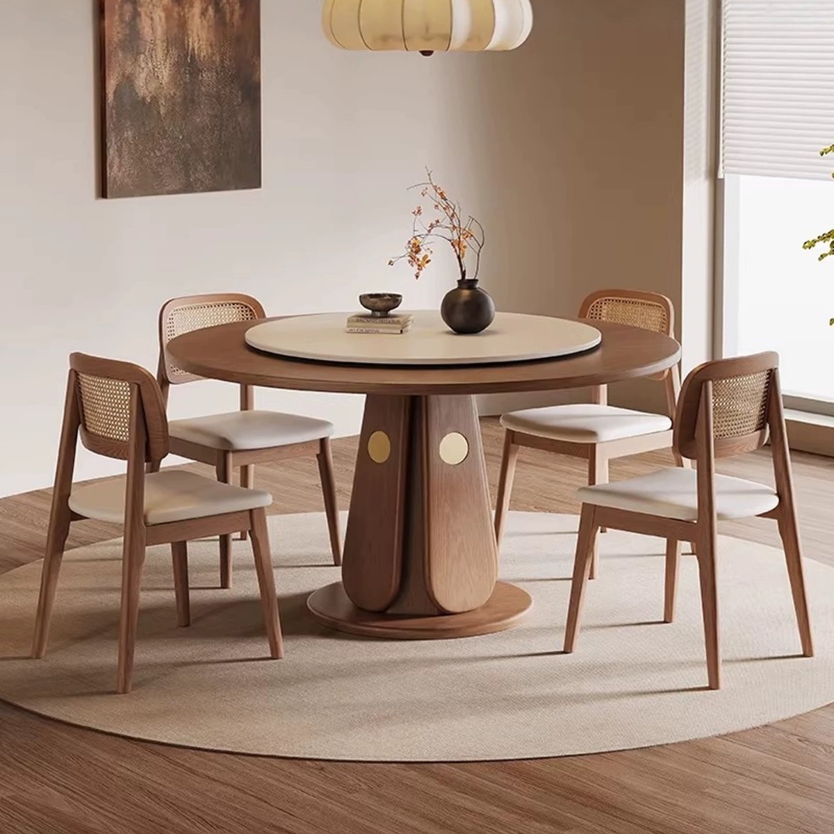 デリフォン無垢材岩板ダイニングテーブル、丸テーブル、家庭用、中世風、小規模住宅向け、円形食卓、回転式デザイン