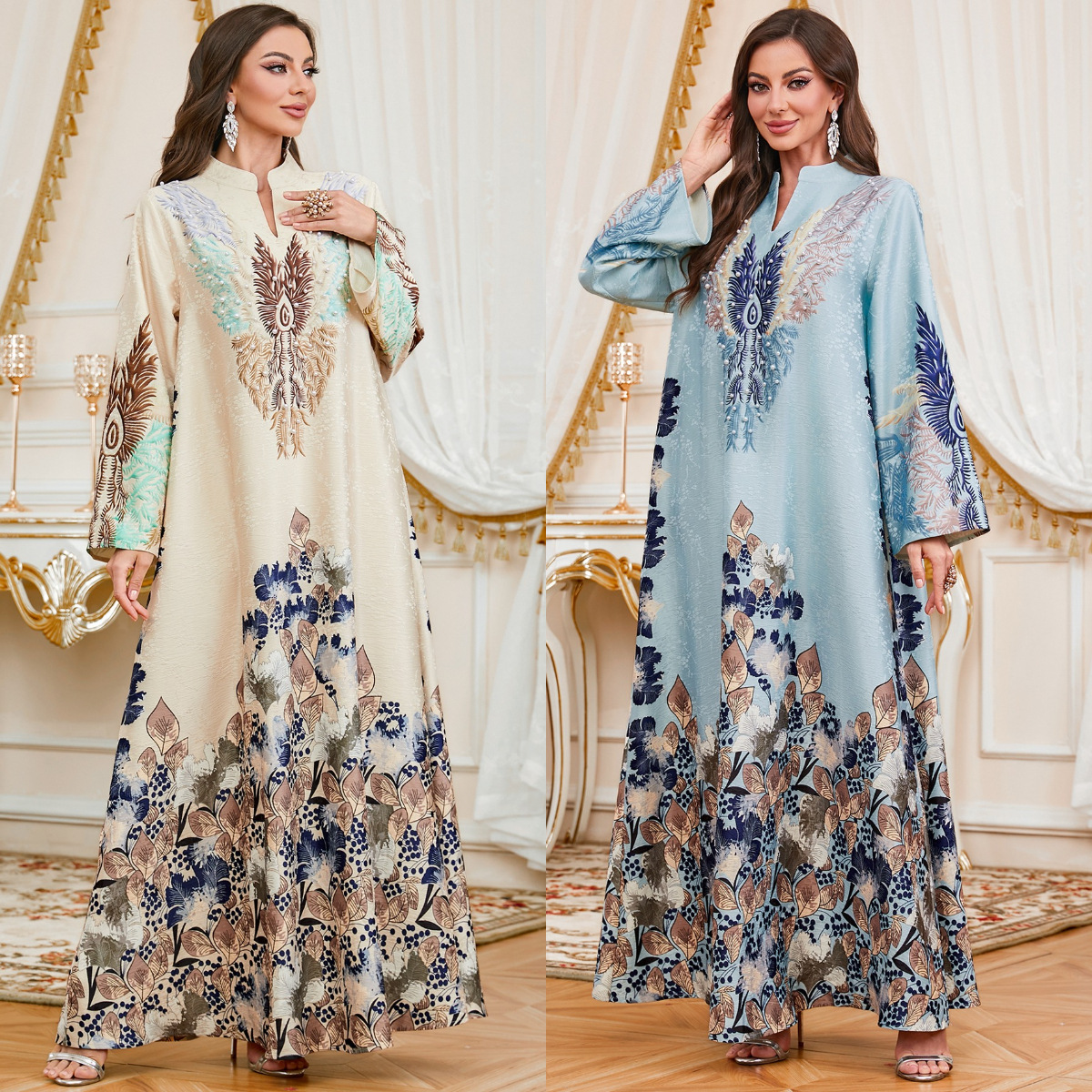 4268中東国境を越えたアマゾンの新しい女装ロングスカートイスラム教徒のローブ釘珠ゆるいプリントワンピース