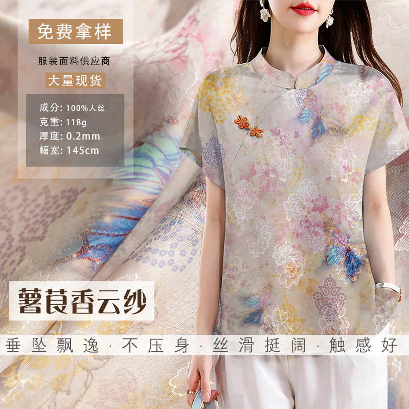 浅粉色花萝香云纱花萝蝴蝶提花面料人丝外套连衣裙裤马甲旗袍布料