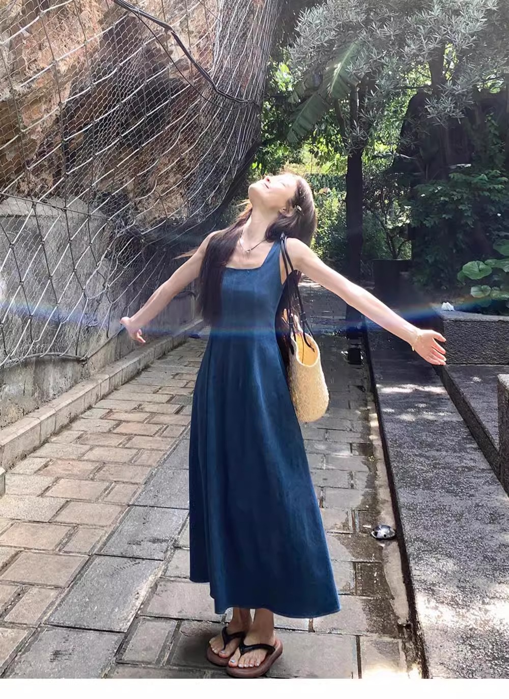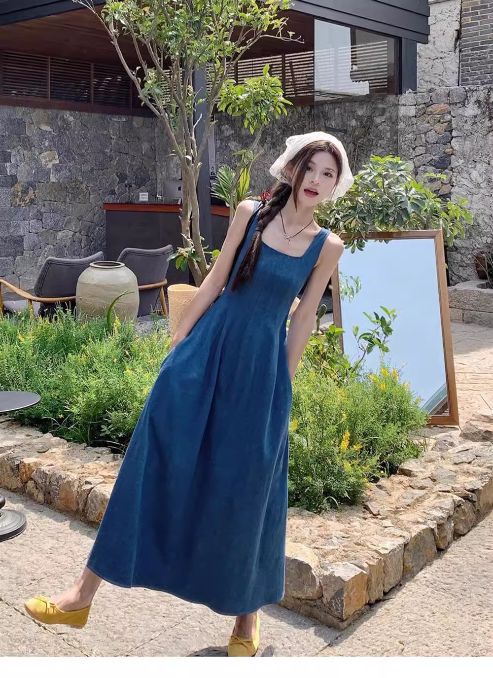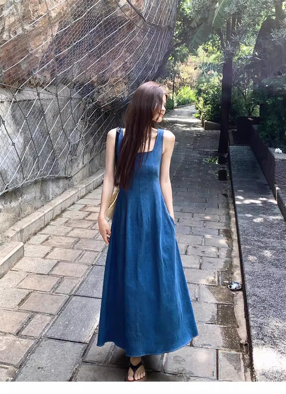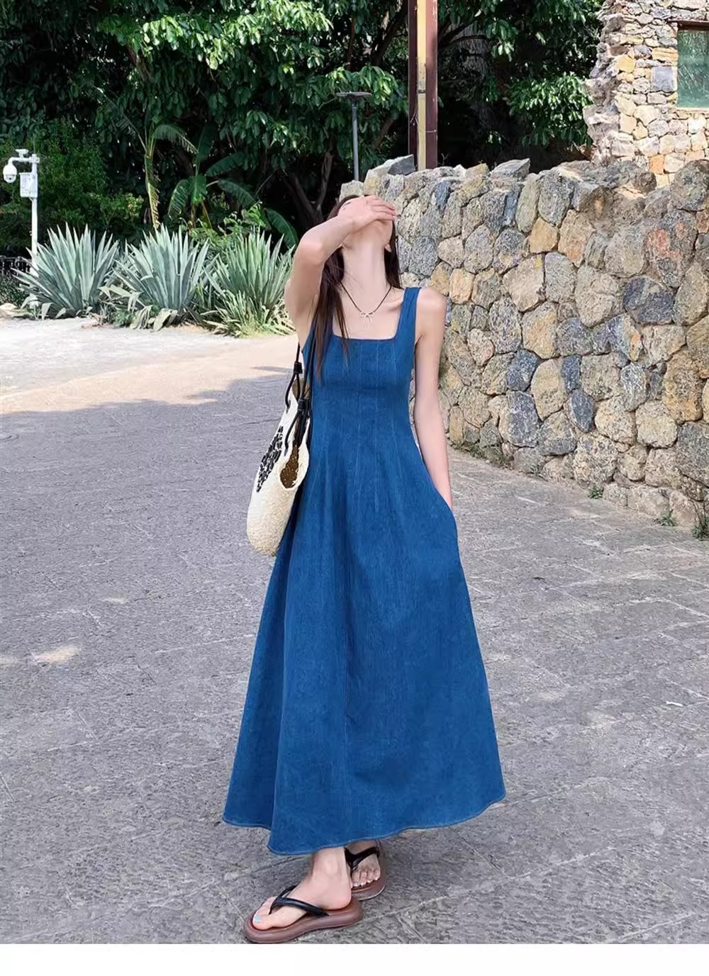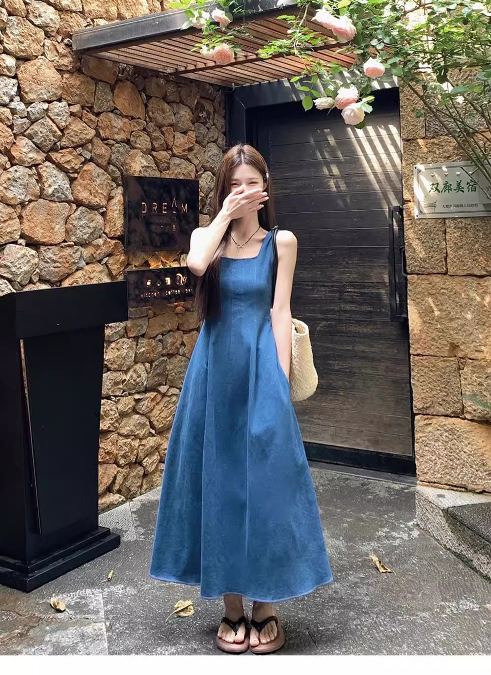 スクエアネックブルーの優しいスタイルのサスペンダードレス、女性用、夏の海辺の休暇、スリムで小柄なミドル丈スカート