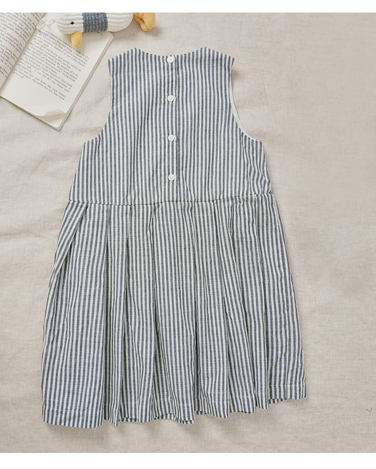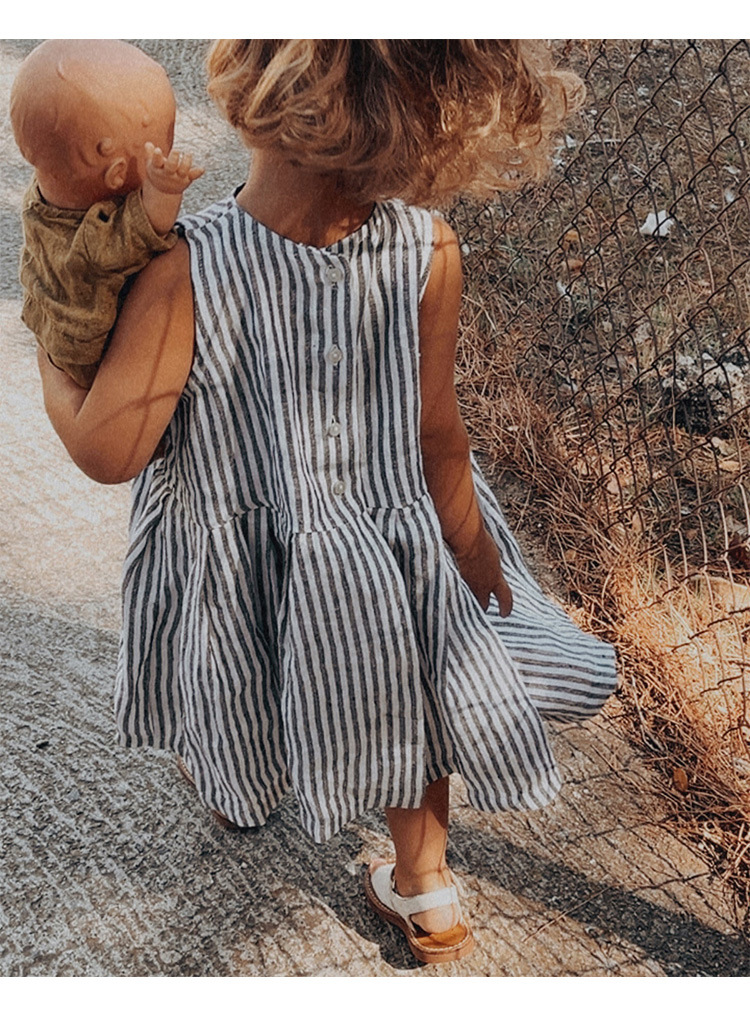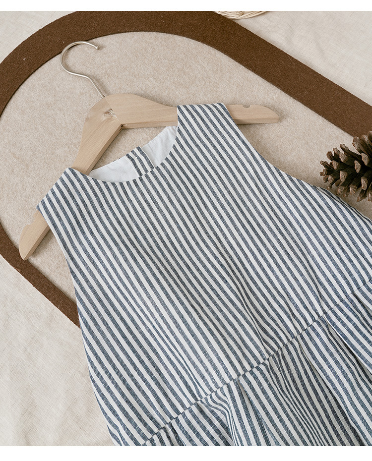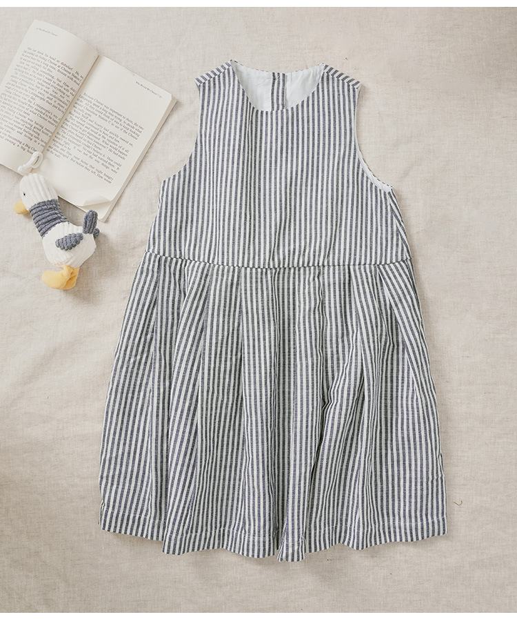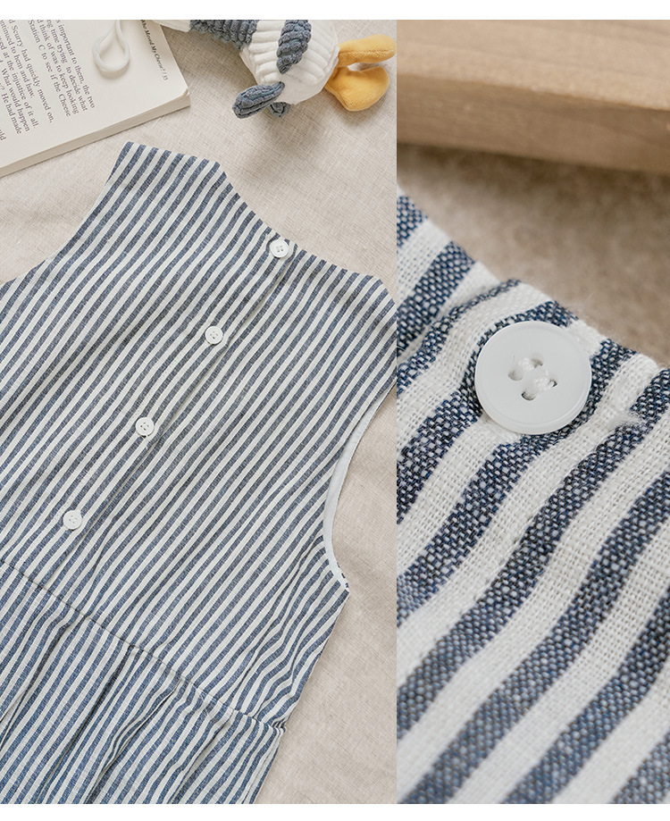 北欧風の色織りストライプワンピース26夏ラウンドネックボタンAラインスカート女の子用ノースリーブベスト綿麻スカート