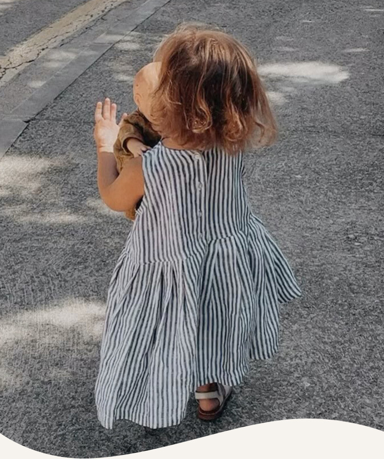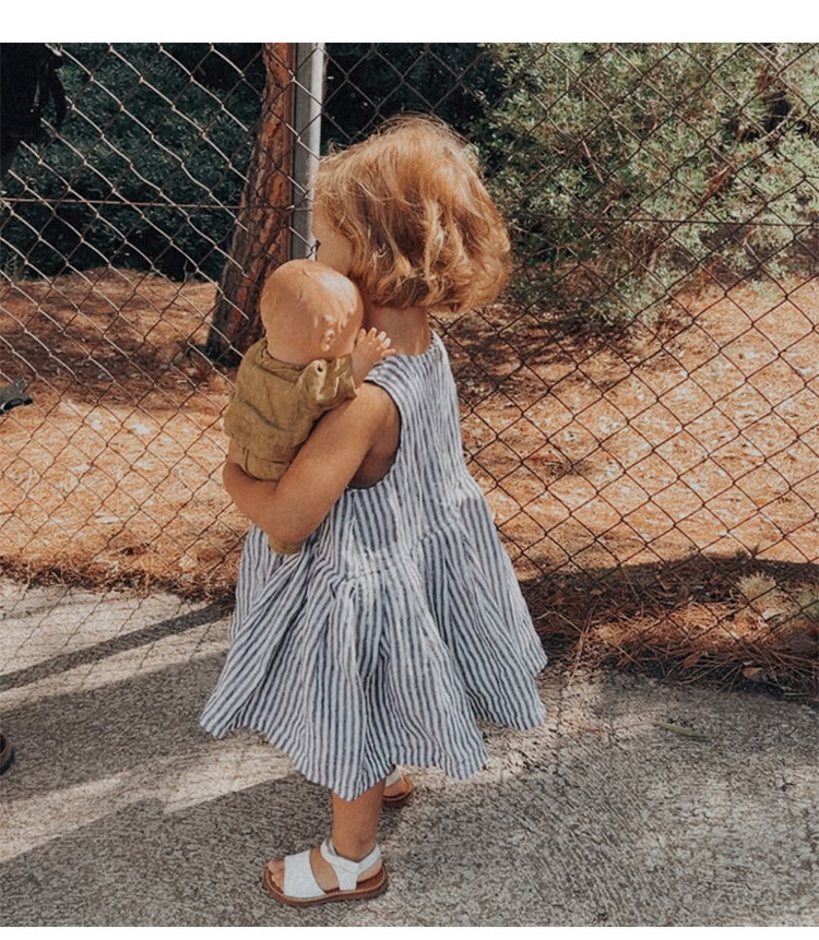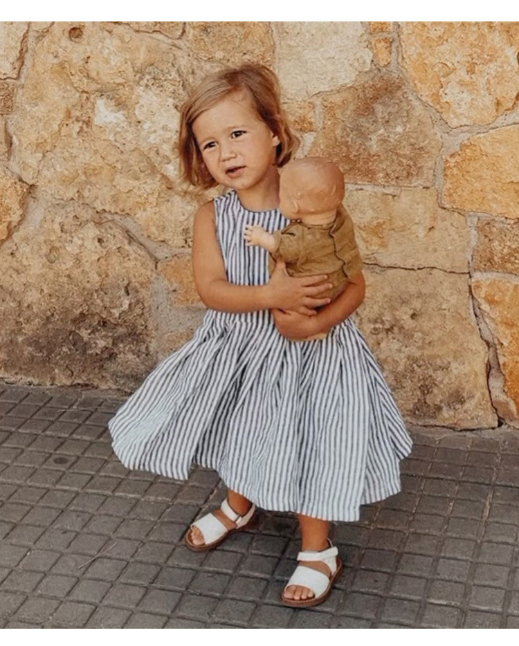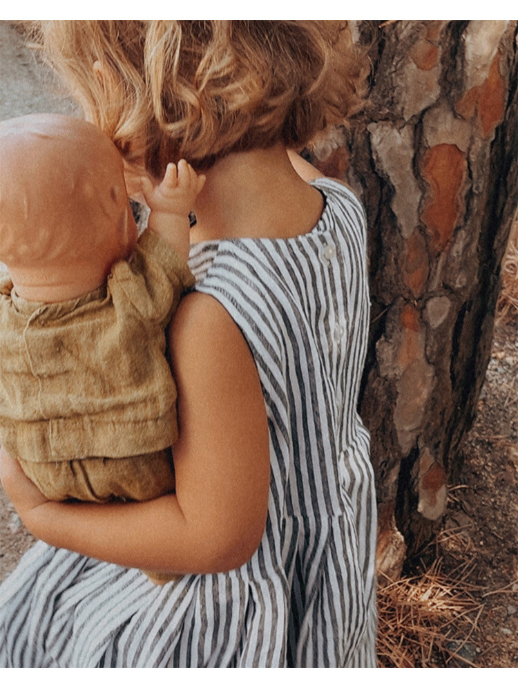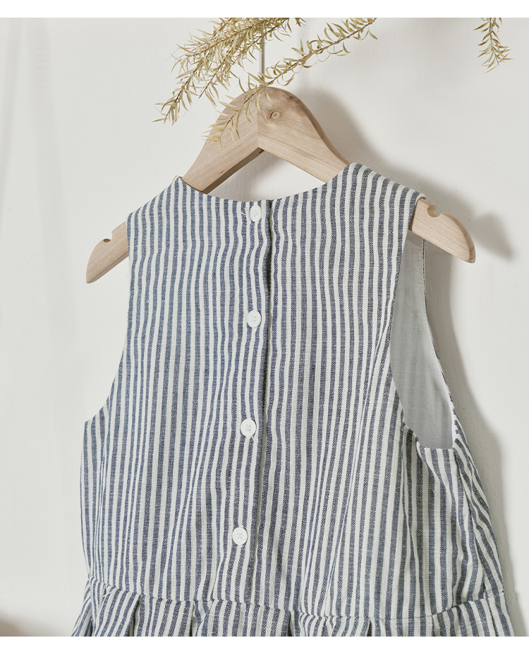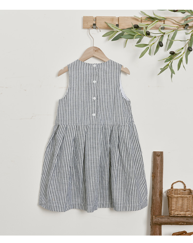 北欧風の色織りストライプワンピース26夏ラウンドネックボタンAラインスカート女の子用ノースリーブベスト綿麻スカート