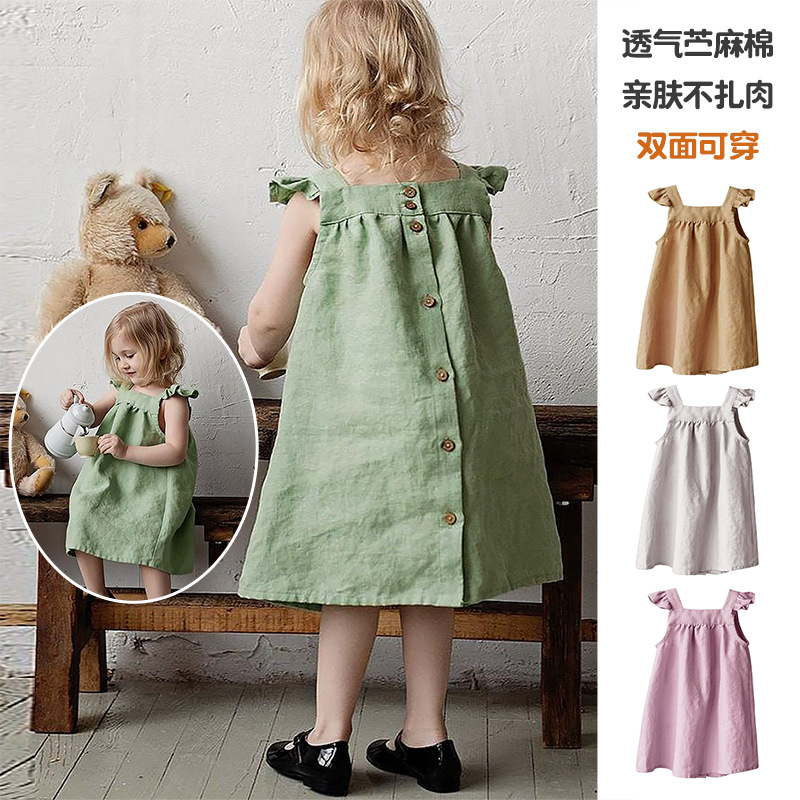 欧米の女性の子供服の亜麻の森系のワンピースの夏の越境の飛袖のサスペンダーのスカートのゆったりしている女性の宝の綿の麻のベストのスカート