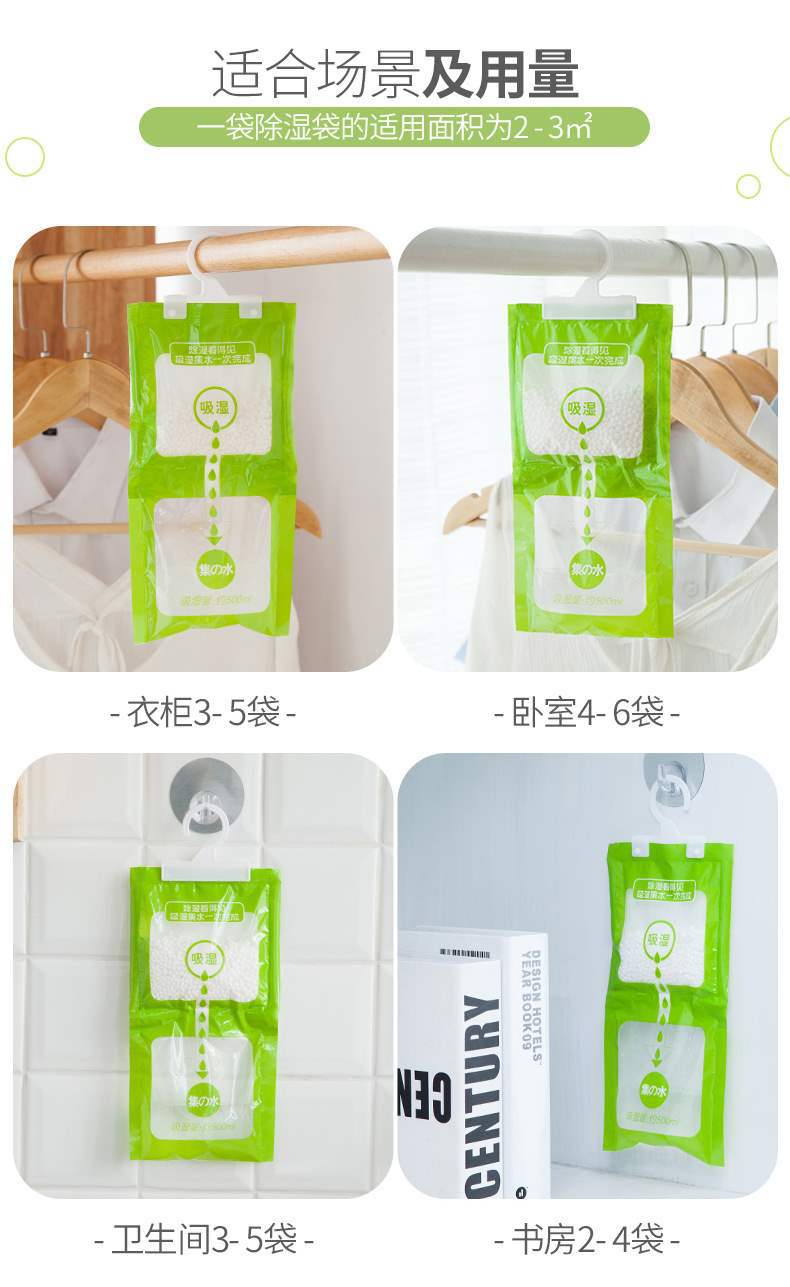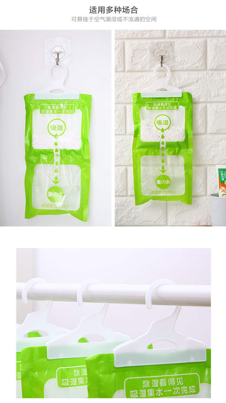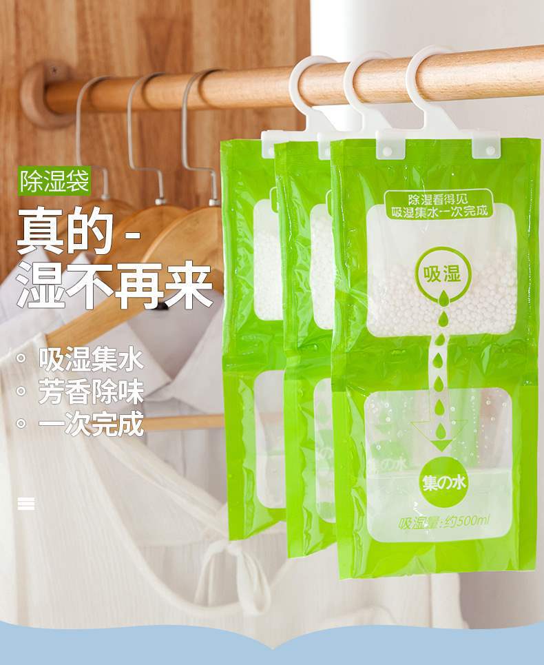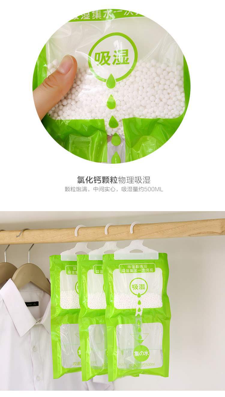 温馨提示:除湿袋在使用前在袋子上用针扎几个孔,挂上就能自动吸潮。