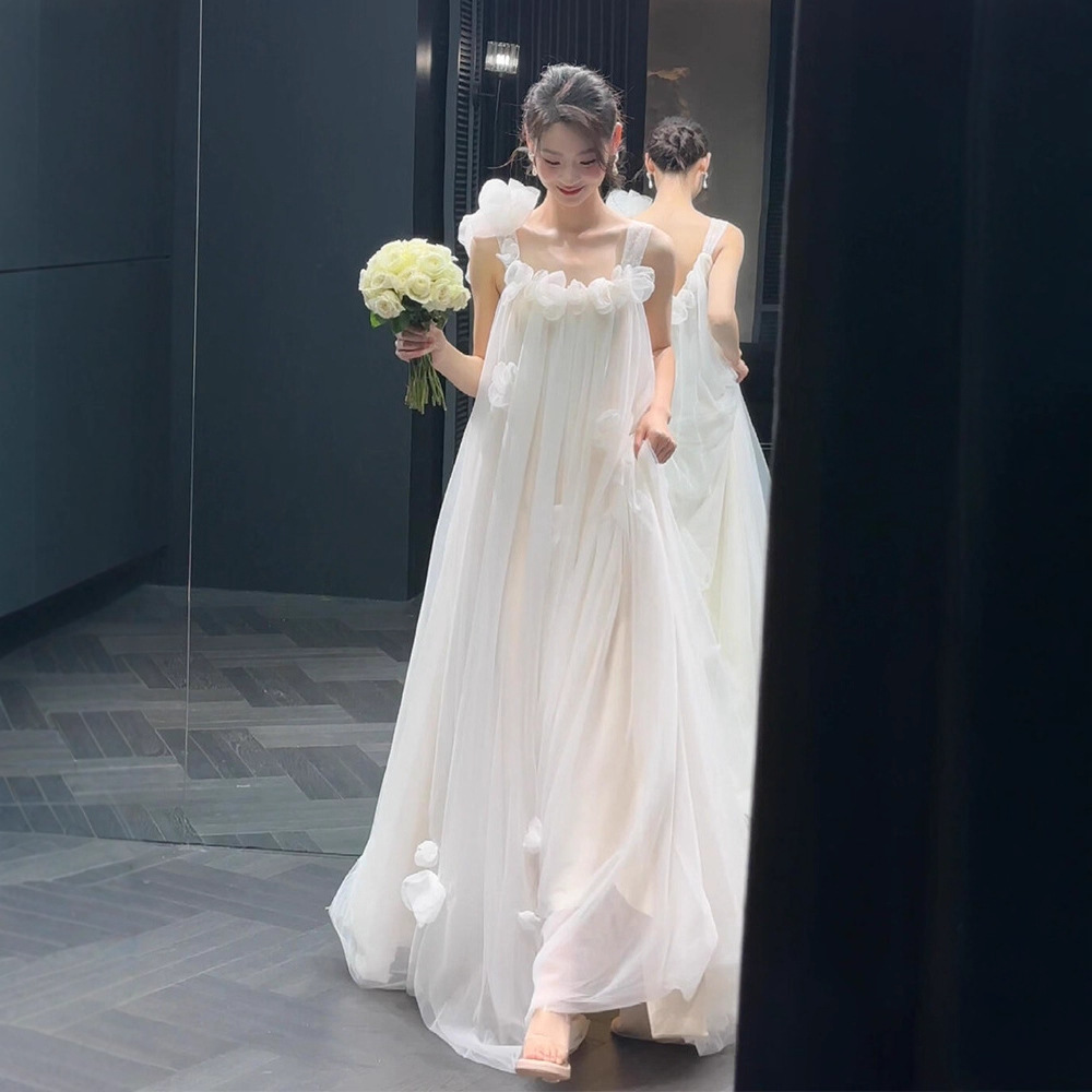 旅行撮影用軽量ウェディングドレス2026冬新作 ノースリーブ外出用ウェディングドレス モーニングローブ 森系 超妖精風逃亡王女風ウェルカムドレス