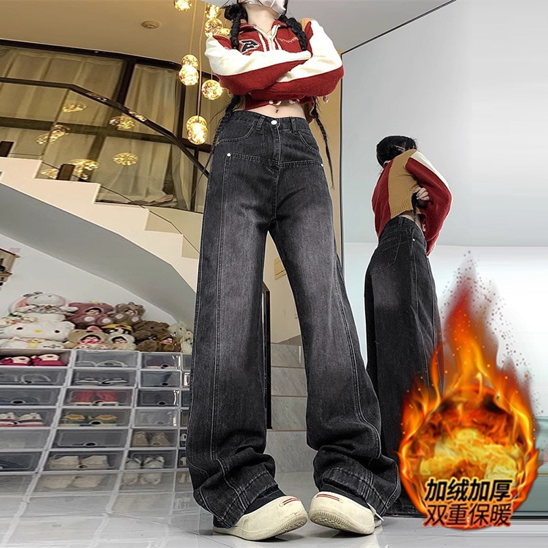 大码加绒阔腿牛仔裤女秋冬2025新款爆款胖mm直筒宽松复古拖地裤子