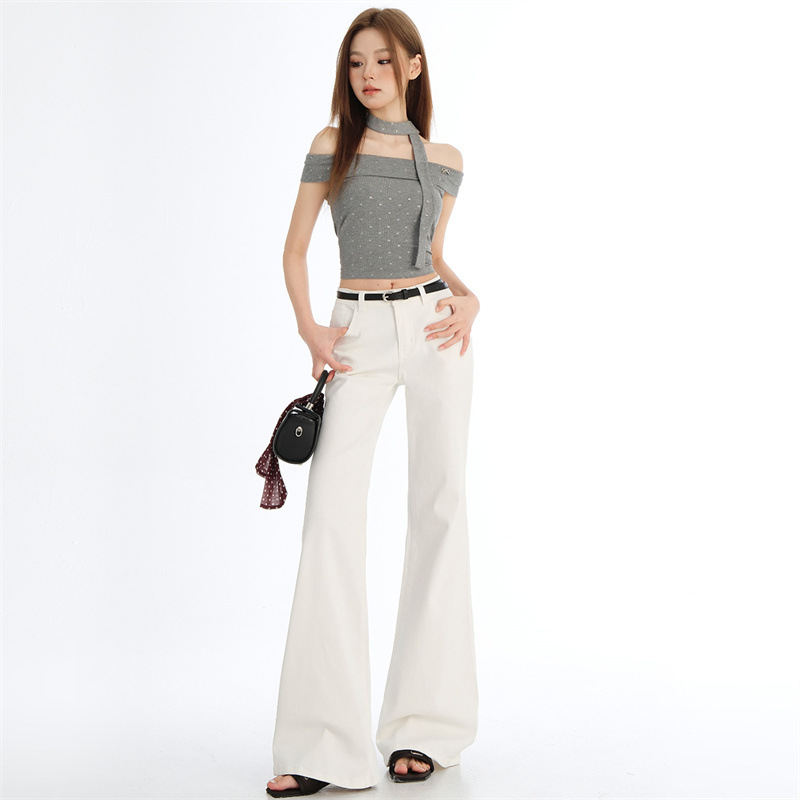 アメリカのギャルの米の白い微ラッパのジーパンの女性の春夏2025新型のハイウエストはやせている設計感の馬蹄のズボンを現します。