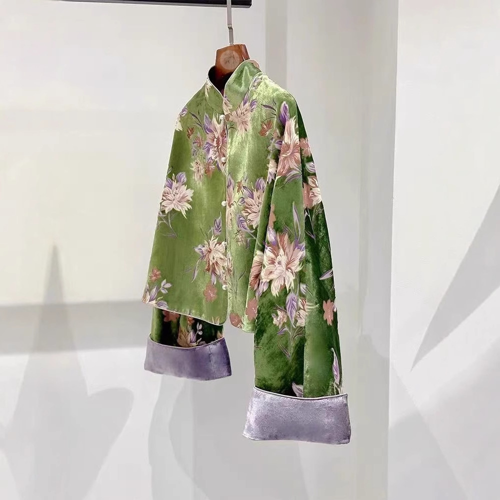 新中式国风高级感小个子立领绿色丝绒盘扣宋锦外套女秋冬2025新款
