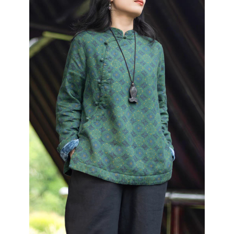 复古香云亚麻棉印花新中式上衣女 冬款立领盘扣加绒保暖棉服小衫