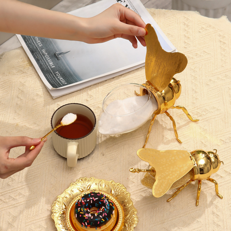 新款镶钻蜜蜂糖盅家用欧式高档厨房带勺调料盒储物罐轻奢家居摆件