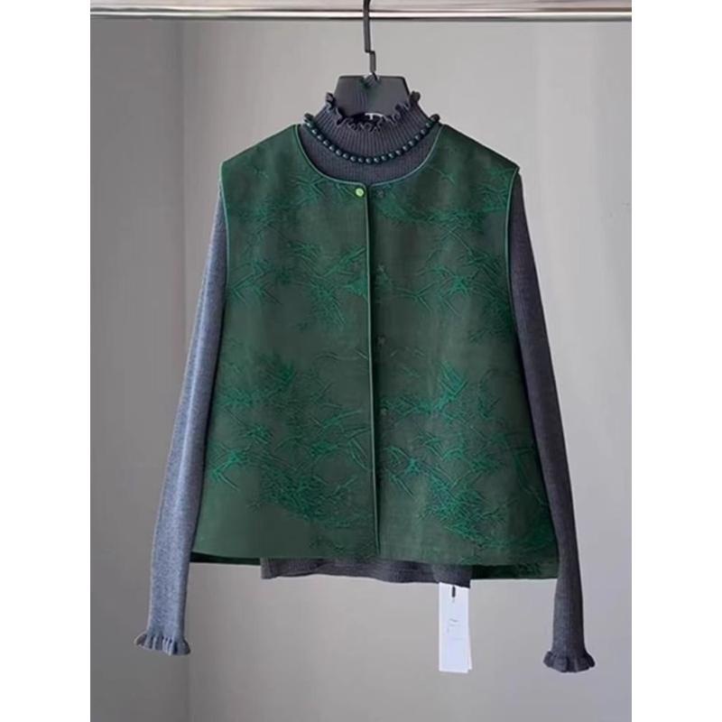 新しい中国風の国民風、年齢を減らす絶妙なグリーンジャカードベスト、マザーズウェア、スタンドカラー、ボタン付きノースリーブトップジャケット