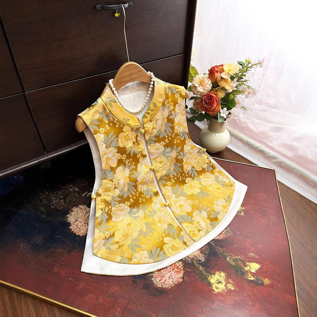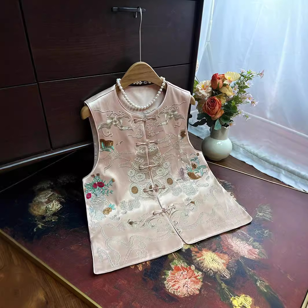 新中国風の国風の両面は馬甲の女性を着て2025春の新型の高級な気質の薄い色の錦のサテンの肩の馬の挟みを着ます。