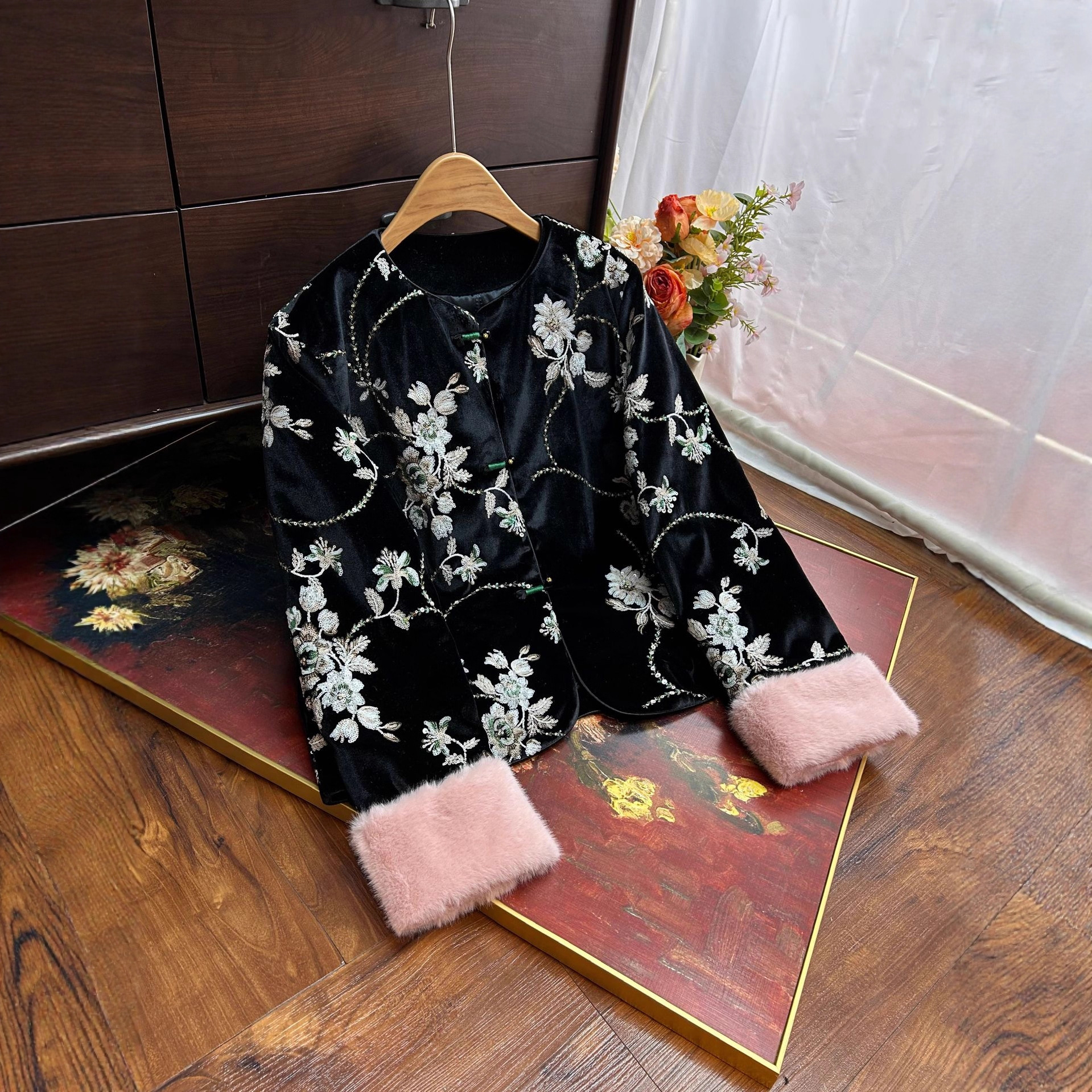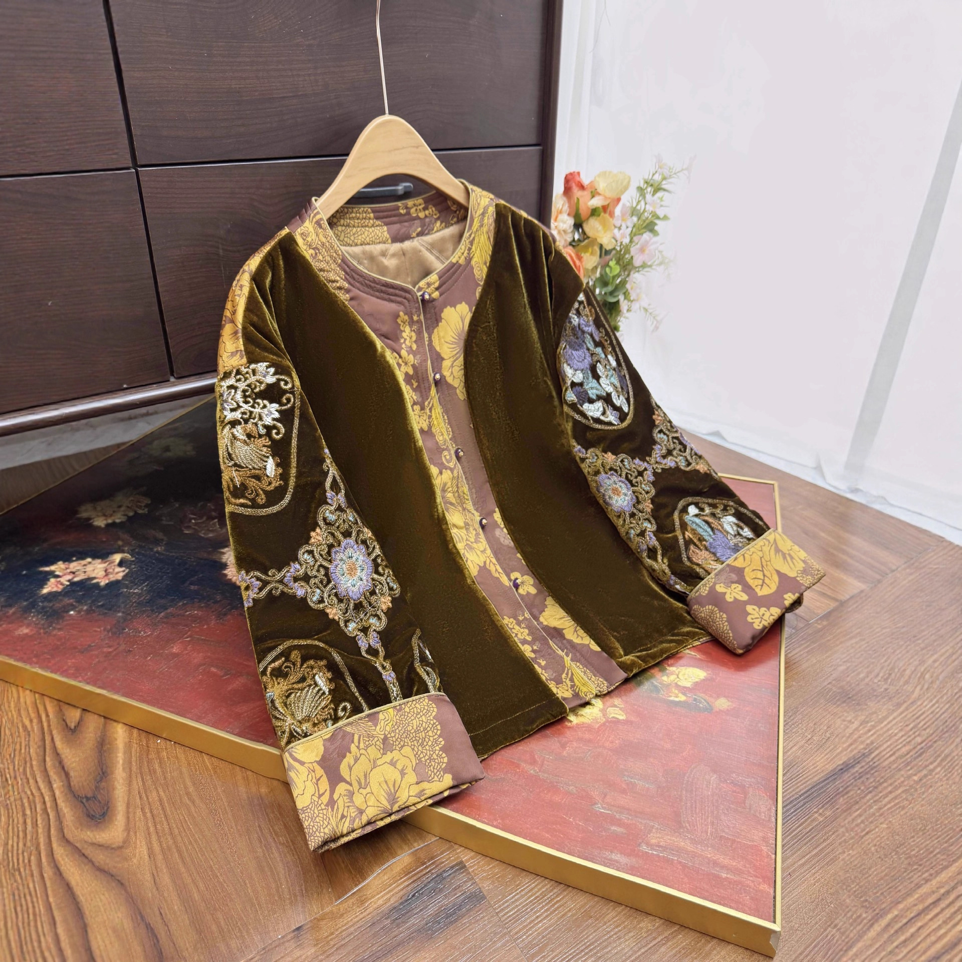 新中式拼接丝绒刺绣加棉外套2025冬季新款国风设计感保暖宽松上衣