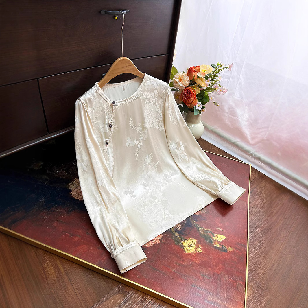 新中国式斜め襟シャツ2025年春新作高級人糸ジャカードレトロ国風百合シャツ上着