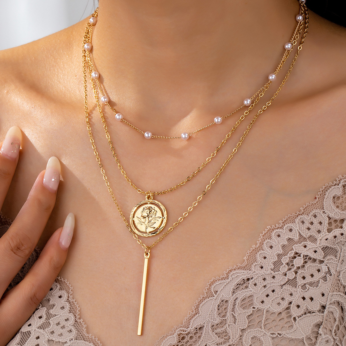 欧米の国境を越えた新型ファッション流行バラ真珠幾何学立体長方形多層ネックレス気質