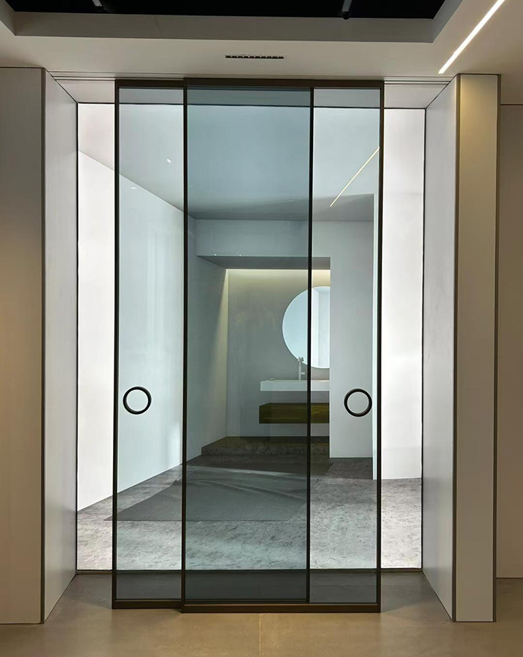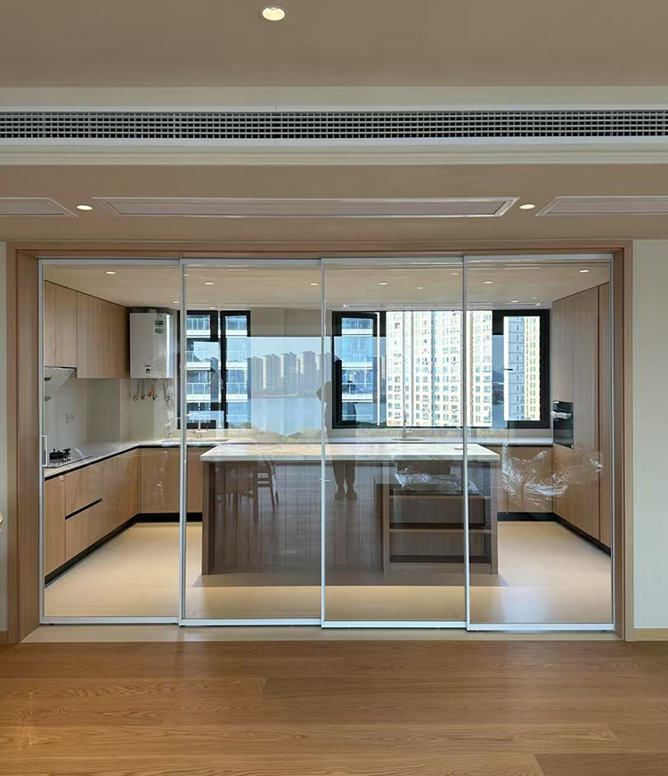 極薄三連動キッチン引き戸、吊り戸、チタンマグネシウム合金、長虹ガラス、佛山16年工場