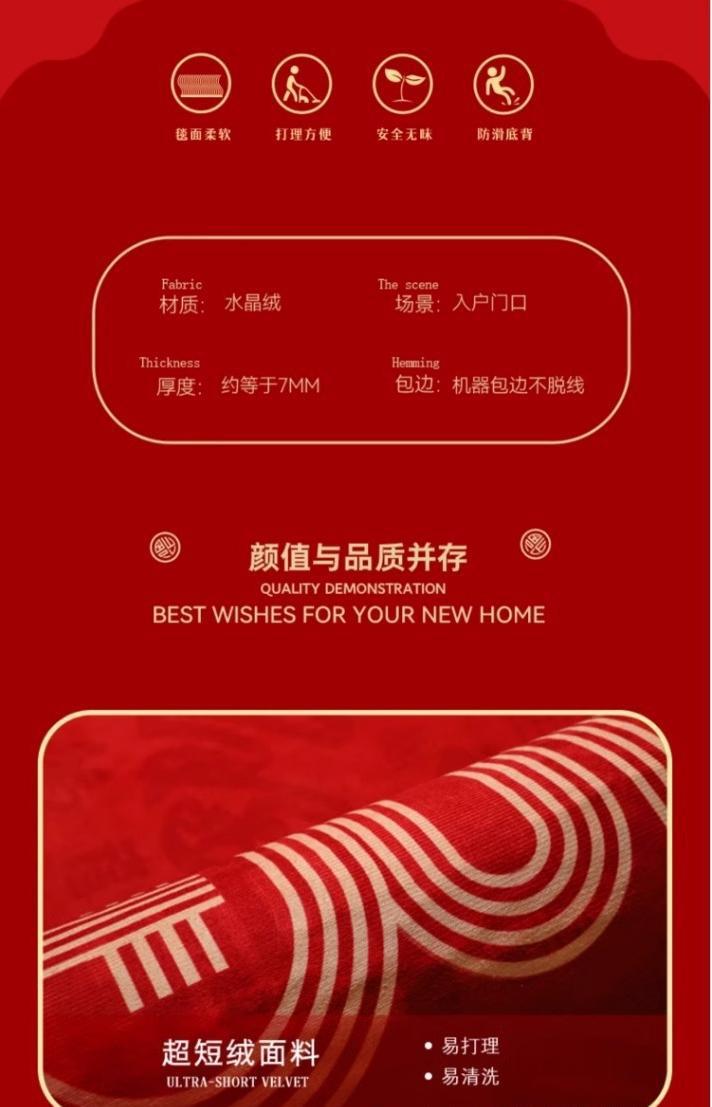 新品红色入户门水晶绒地垫进门门口地毯玄关防滑耐脏新中式脚垫批