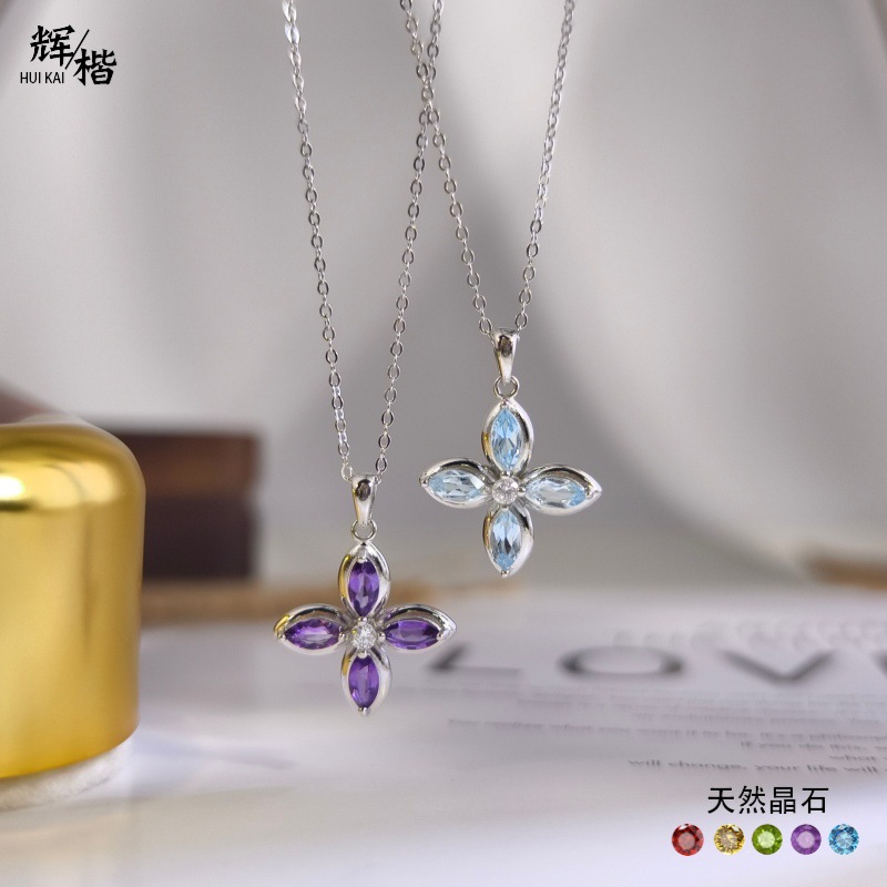 新款天然水晶石四叶草花瓣吊坠s925纯银项链女创意小众百搭礼物女