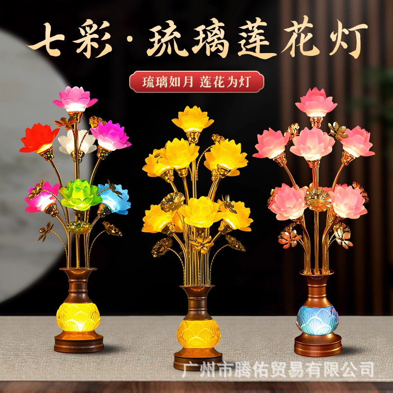 寺院蓮ランプ、電気式LEDカラフルガラス蓮ランプ、長明ランプ、家庭用ランプ、仏教寺院フロアランプ