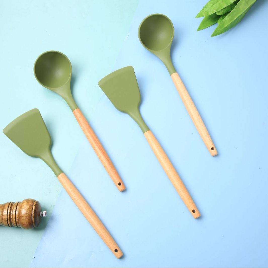メーカー卸売木製ハンドルシリコンスパチュラノンスティックパン特別な高温耐性家庭用ブナ材スパチュラスープスプーンキッチン用品セット