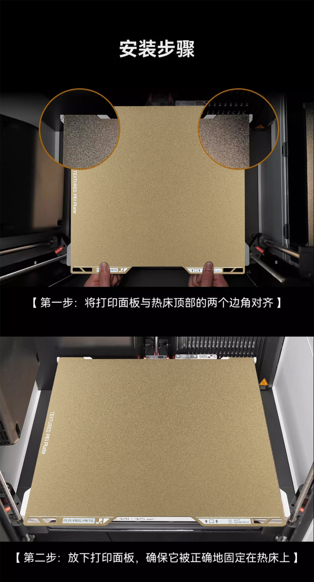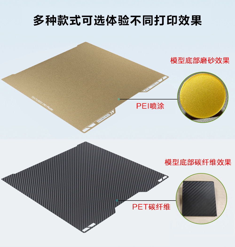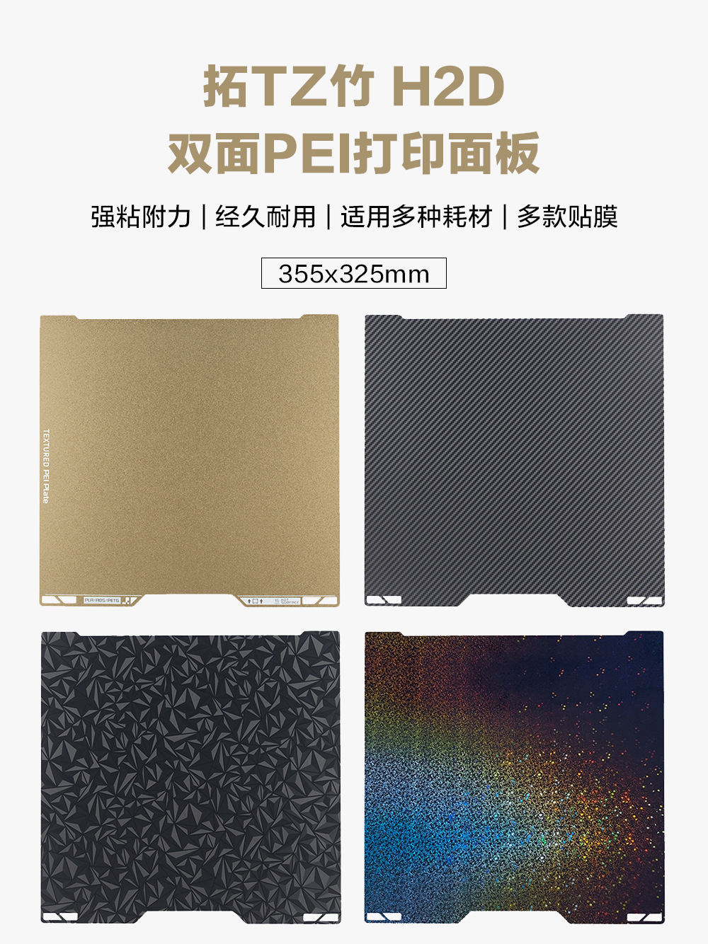 说明:拓TZ竹H2D双面金色PEI喷涂平台厚度为0.8mm,一面金色PEI喷涂+一面纹理贴膜平台厚度为0.8mm~0.9mm之间,批次不同可能有些许误差。