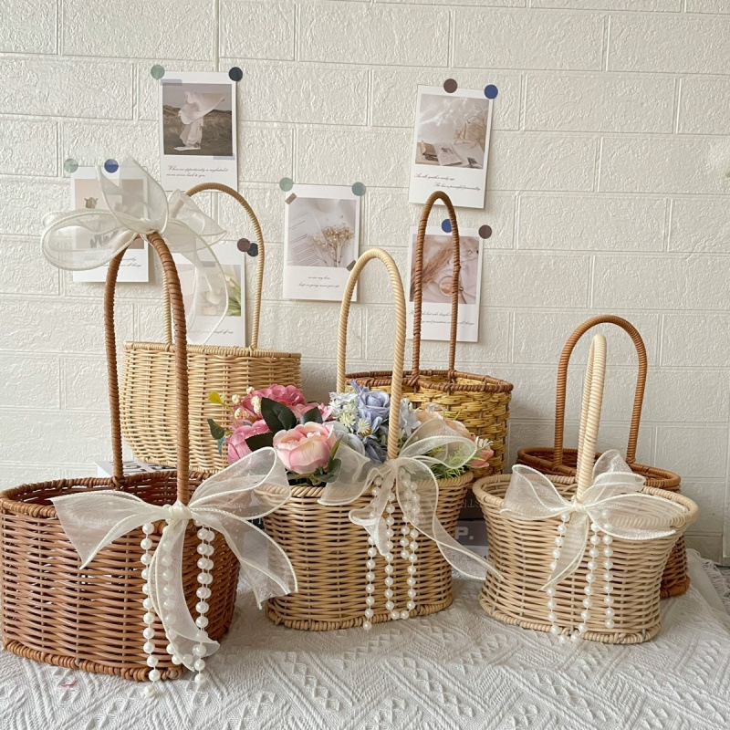 織りハンドヘルドパールお土産バスケット満月結婚式ブライズメイド誕生日イベント小さなギフトボックス竹編みレディースバッグ