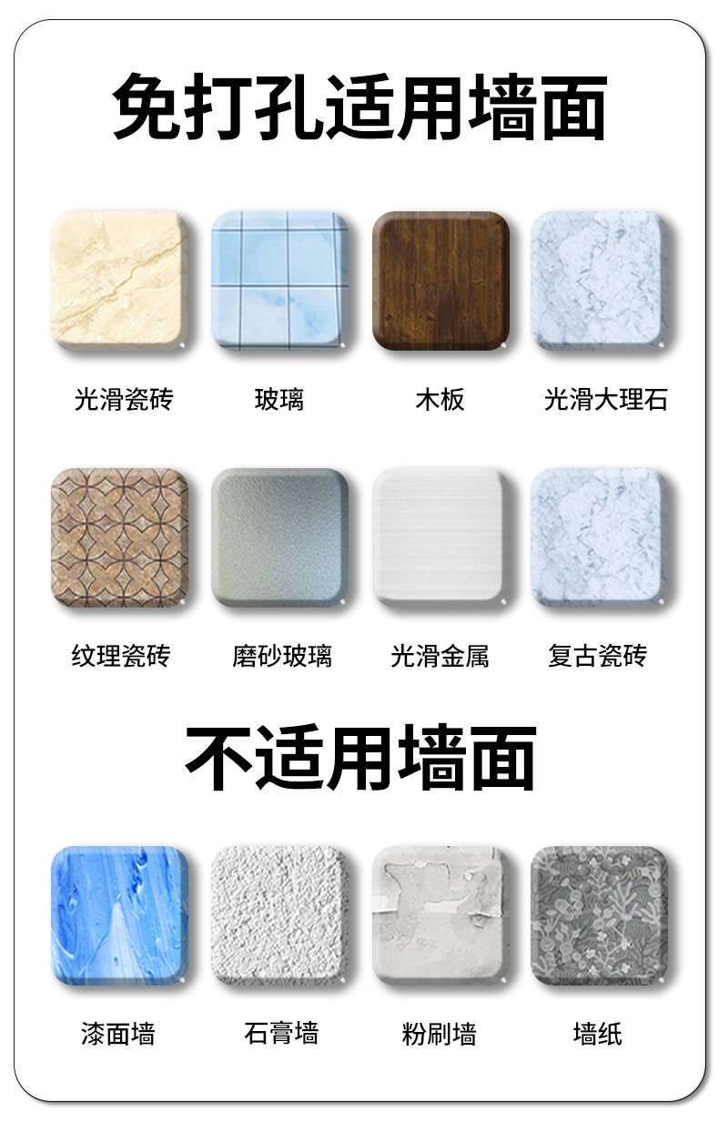 (2)安装请注意,墙面需平整坚固的玻璃瓷砖等。不可用在粉刷墙,墙纸,石灰墙等不平整不坚固的墙面上。