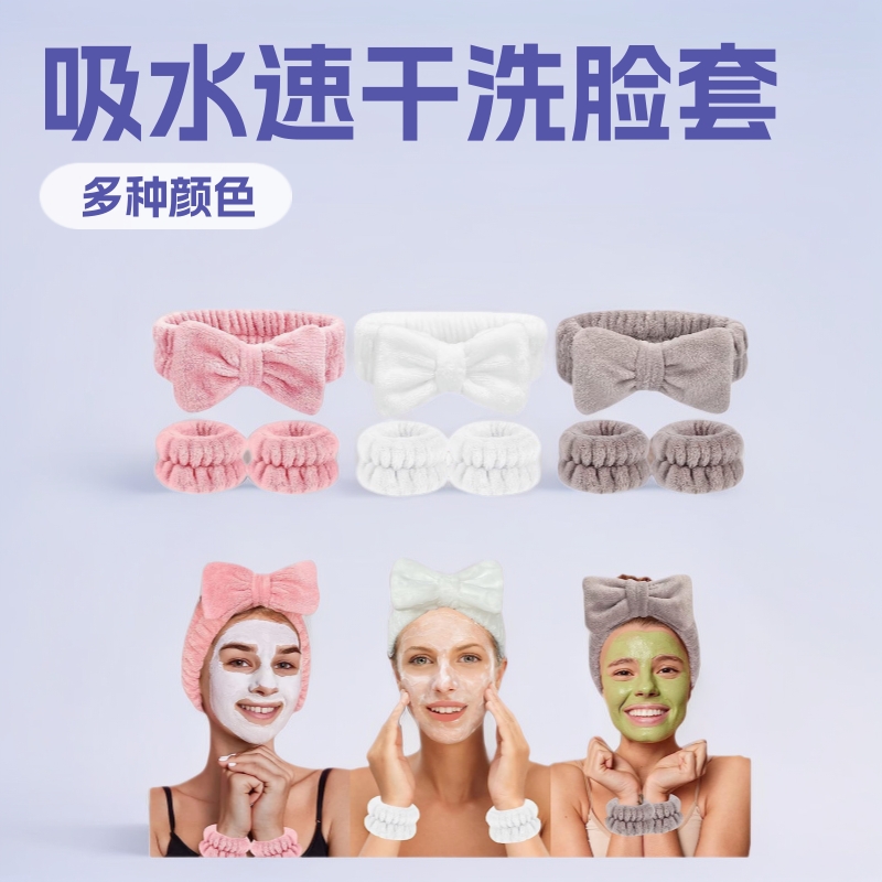 蝶結びヘアバンド、リストバンド、洗顔3点セット 女性用 ふわふわ袖口 吸水速乾 ふわふわセット 新品