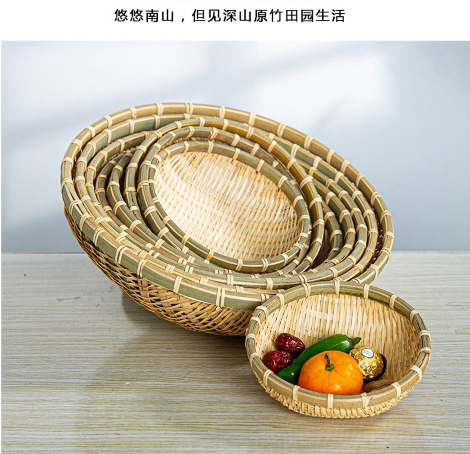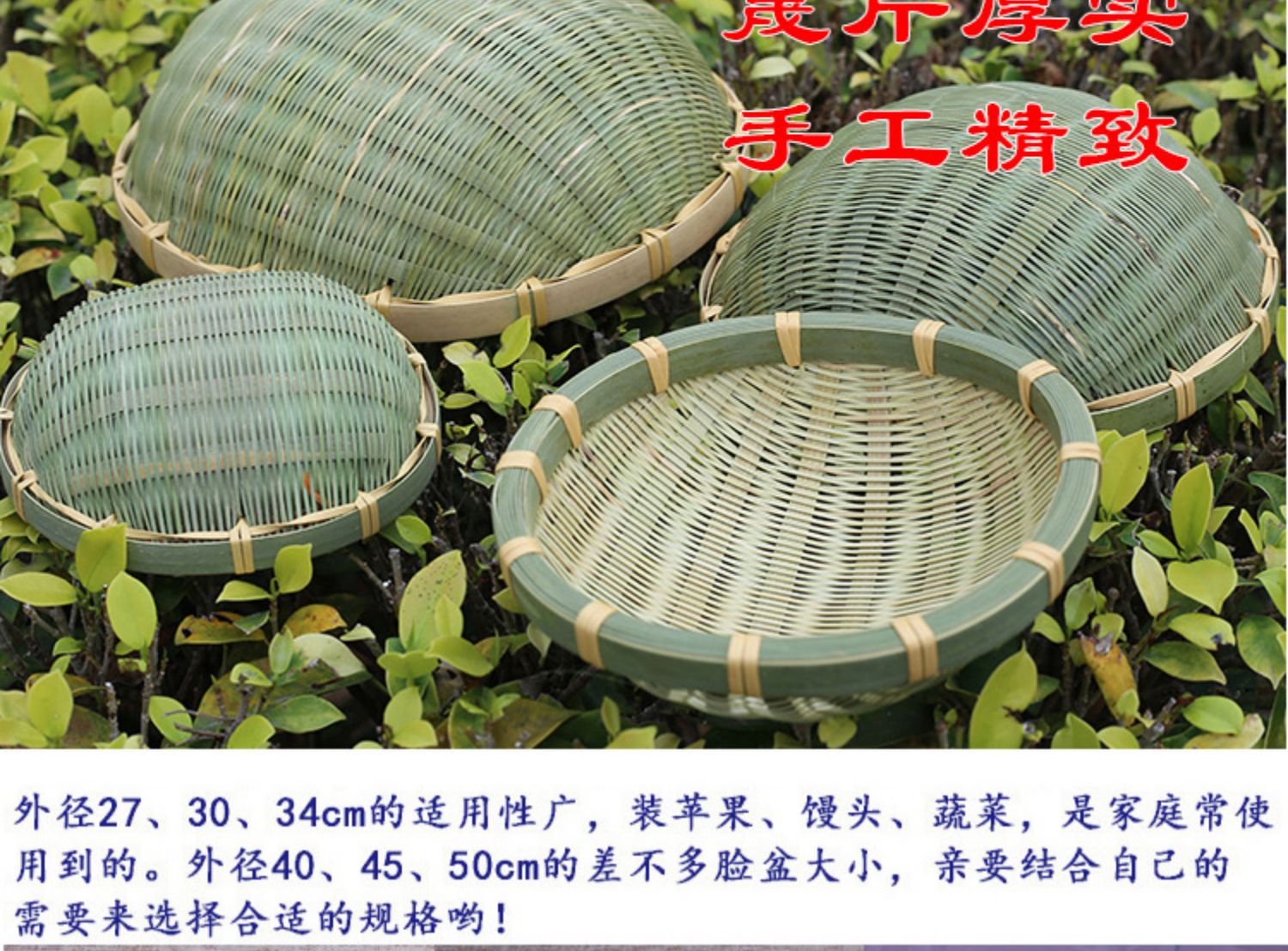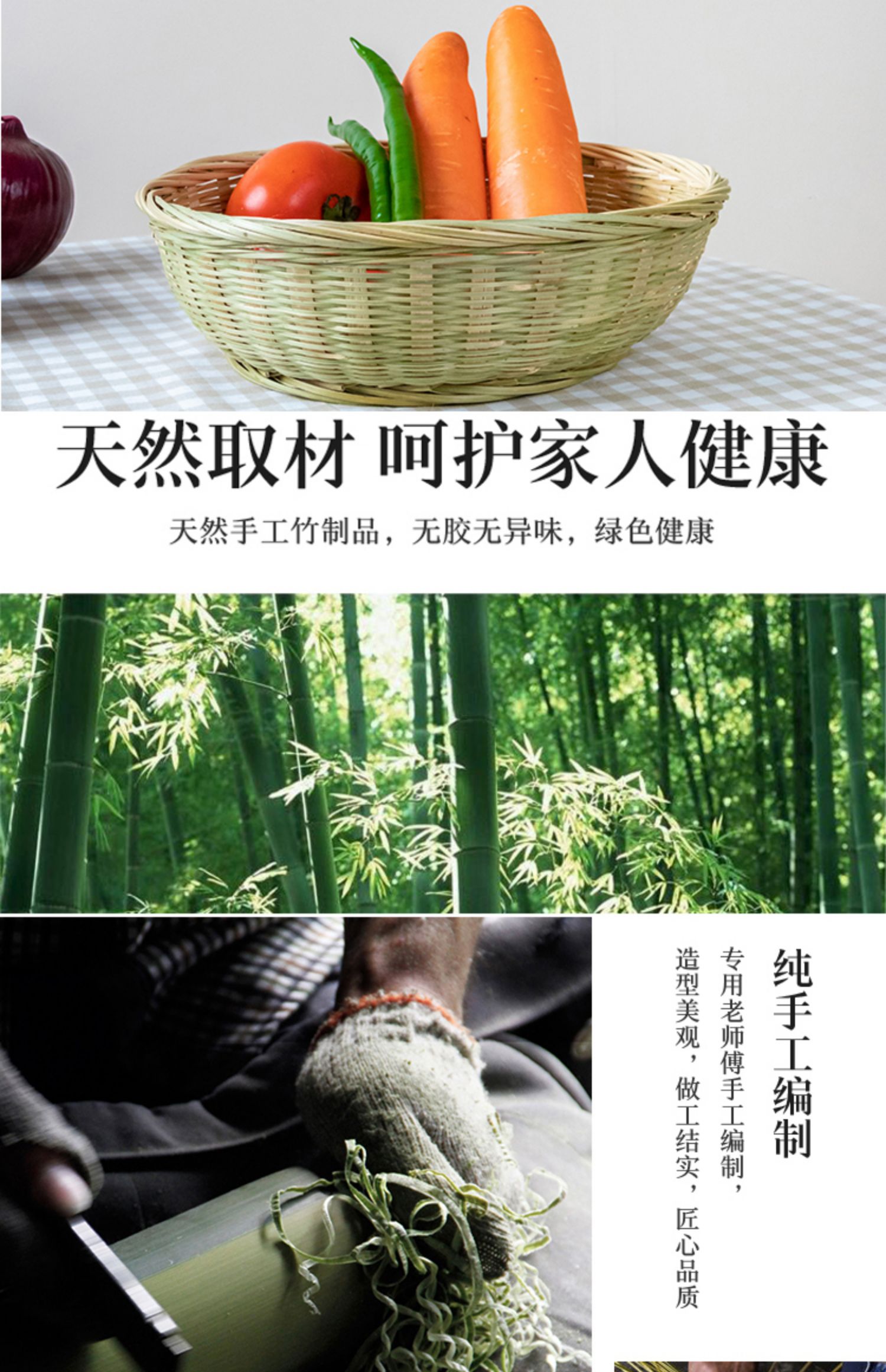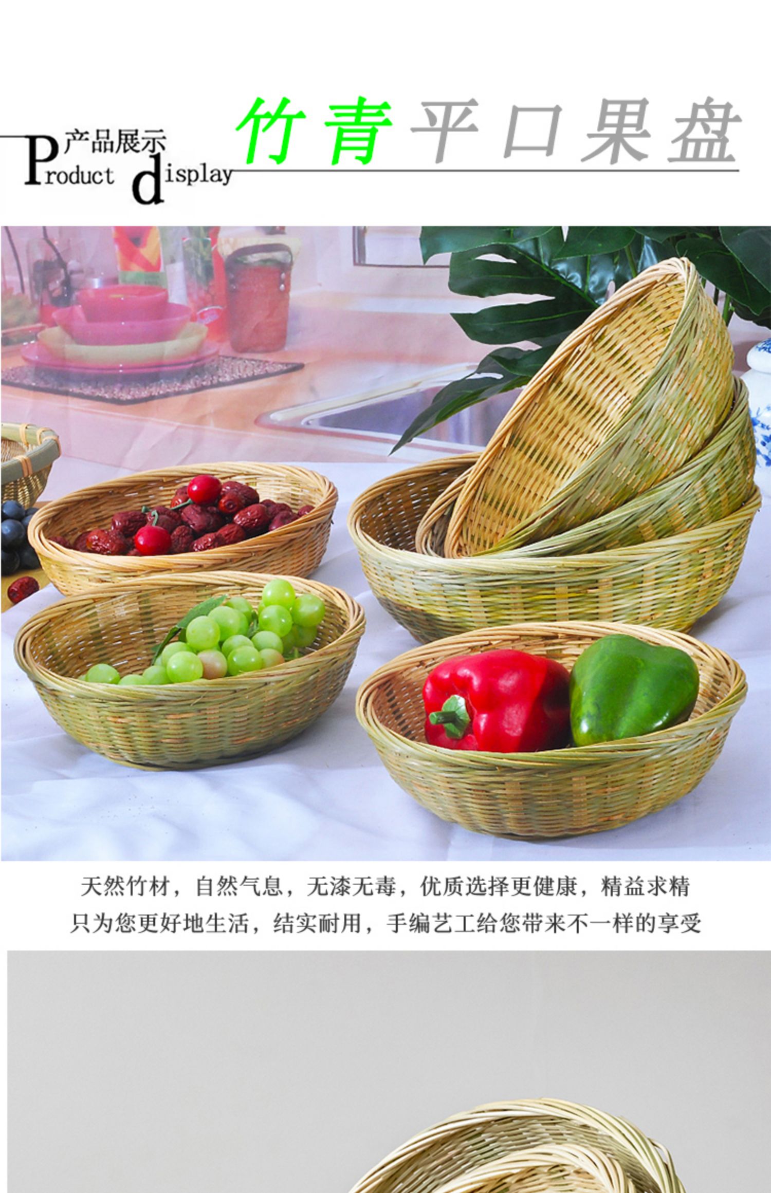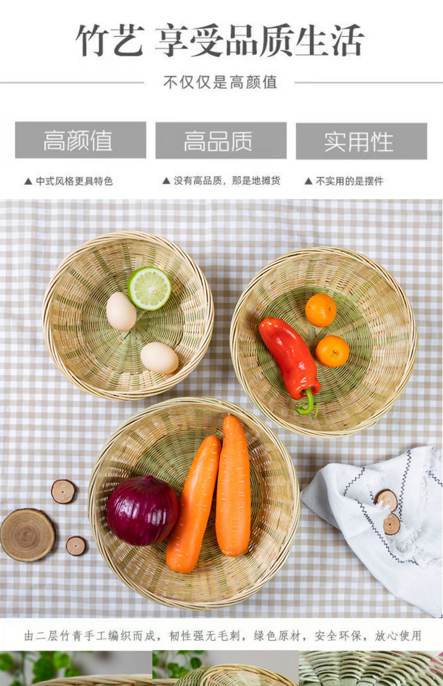 竹緑の果物かご、竹かご、竹かご、手作り竹製品、野菜かご、竹ふるい、平底丸まんかご