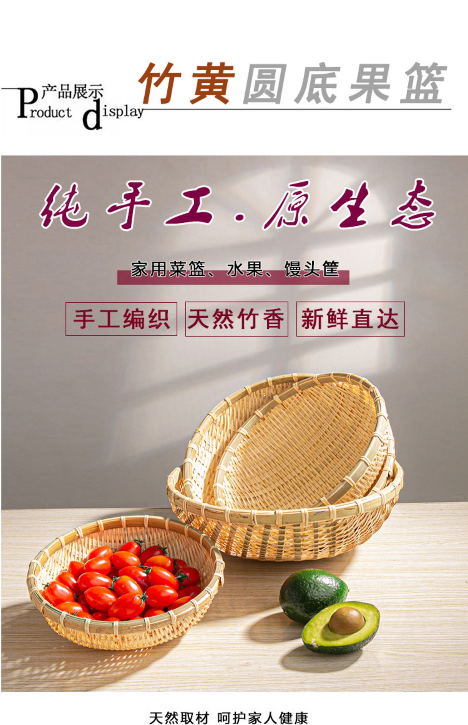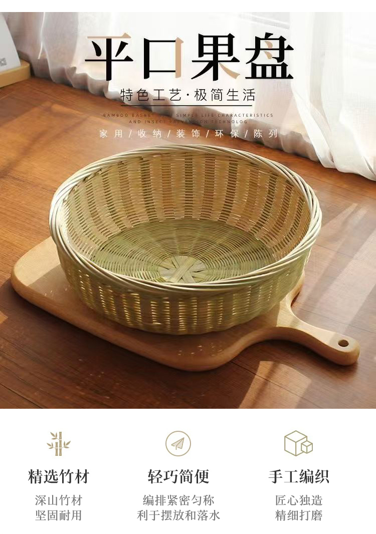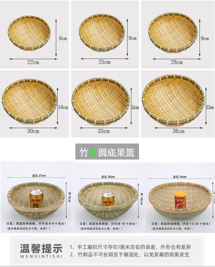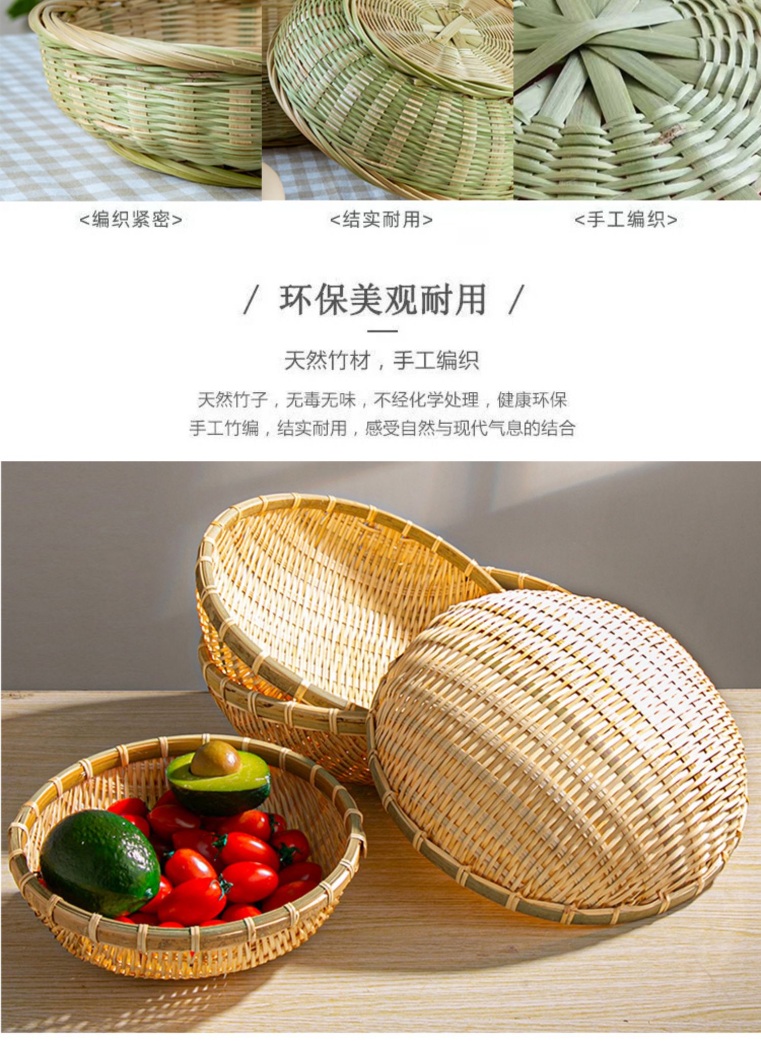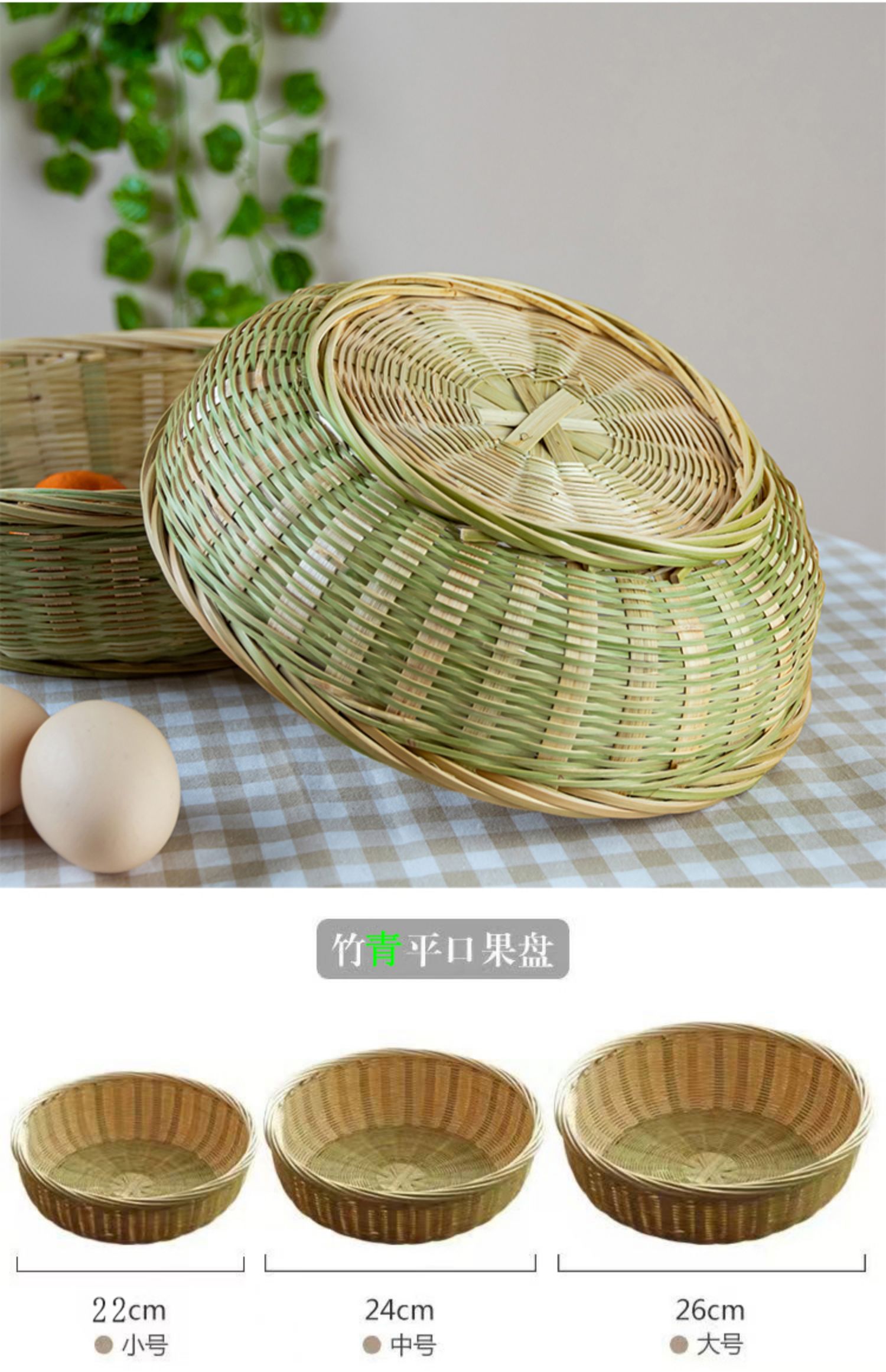 竹緑の果物かご、竹かご、竹かご、手作り竹製品、野菜かご、竹ふるい、平底丸まんかご