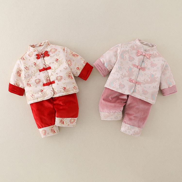 冬の新型の赤いお祝いの新年の綿の服のスーツの女性の赤ちゃんの唐の服装の漢服の新しい中国式の織錦の2つのセット