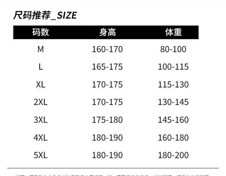 Mサイズ推奨体重80-50kg,Lサイズ推奨体重100-57.5kg,XLサイズ推奨体重115-65kg,2XLサイズ推奨体重130-72.5kg,サイズ 3XL 推奨体重 145-80kg,サイズ 4XL 推奨体重 160-90kg,サイズ 5XL の推奨体重は 180 ~ 100kg です。