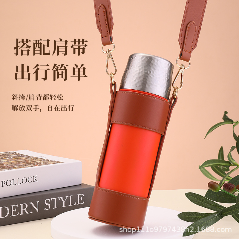 高档皮质钛杯杯套保温杯通用水杯套可斜跨长背带pu皮革保护套批发