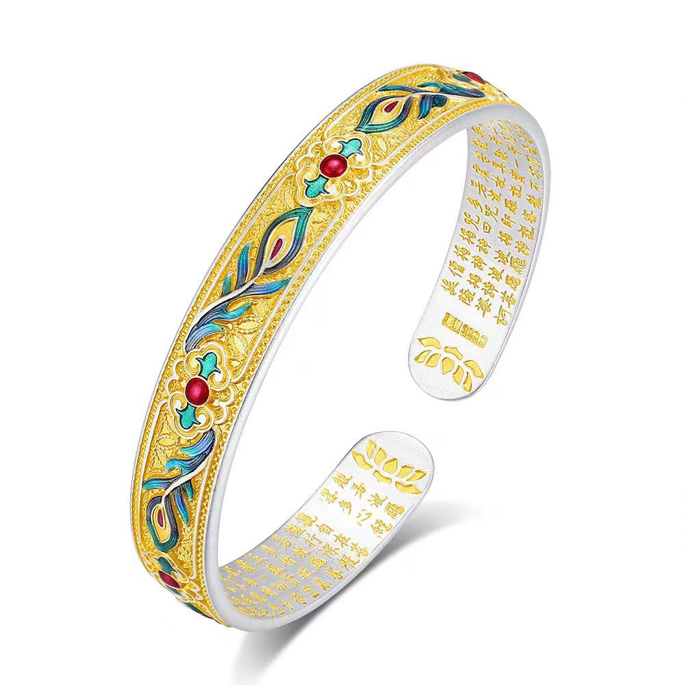 中世スタイルの中国風鳳凰の羽のブレスレット、ゴールドエナメルカラー般若心経調整ソリッドシルバーブレスレット、ニッチデザインブレスレット