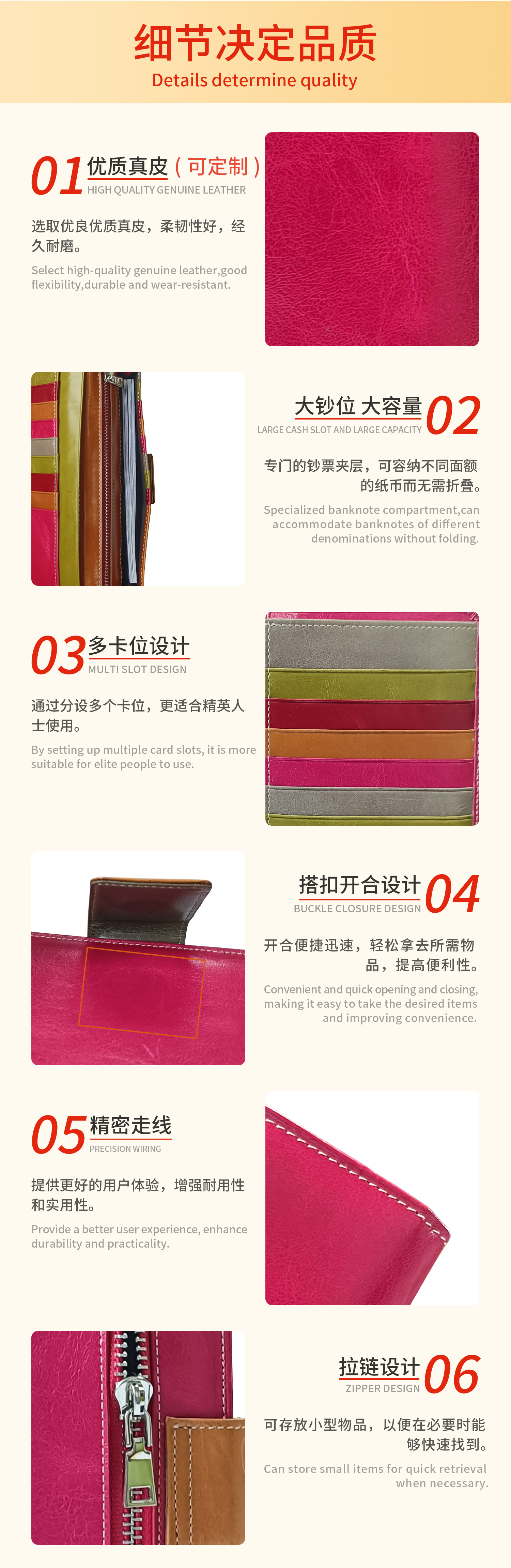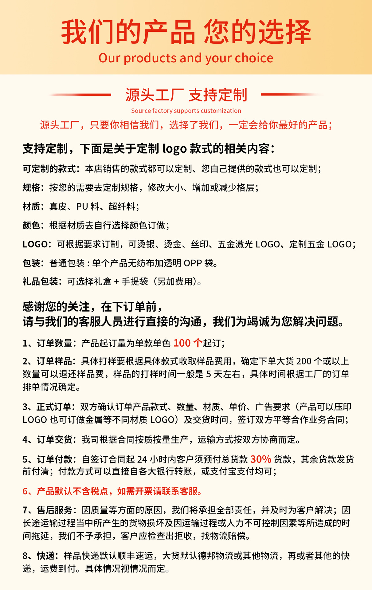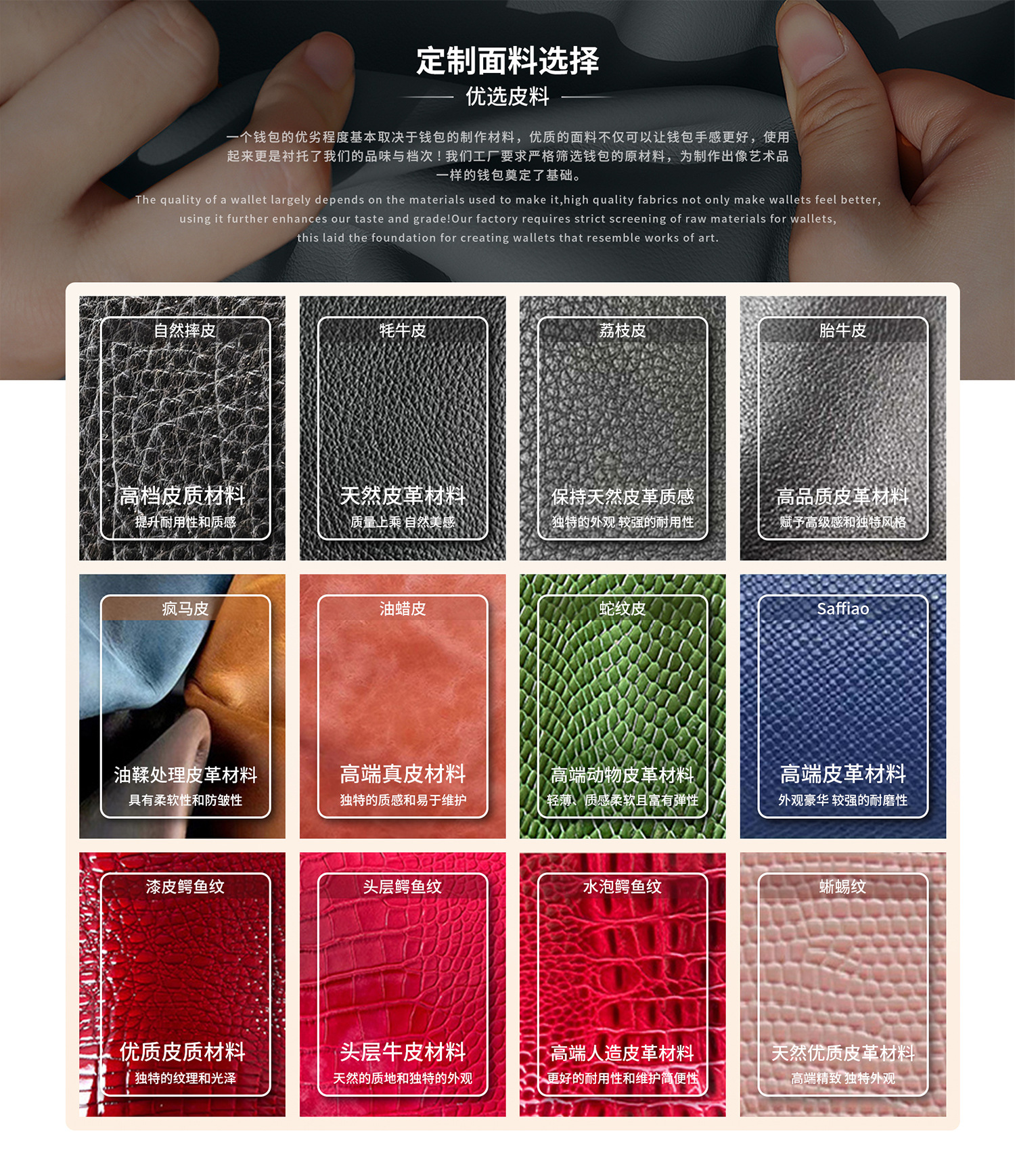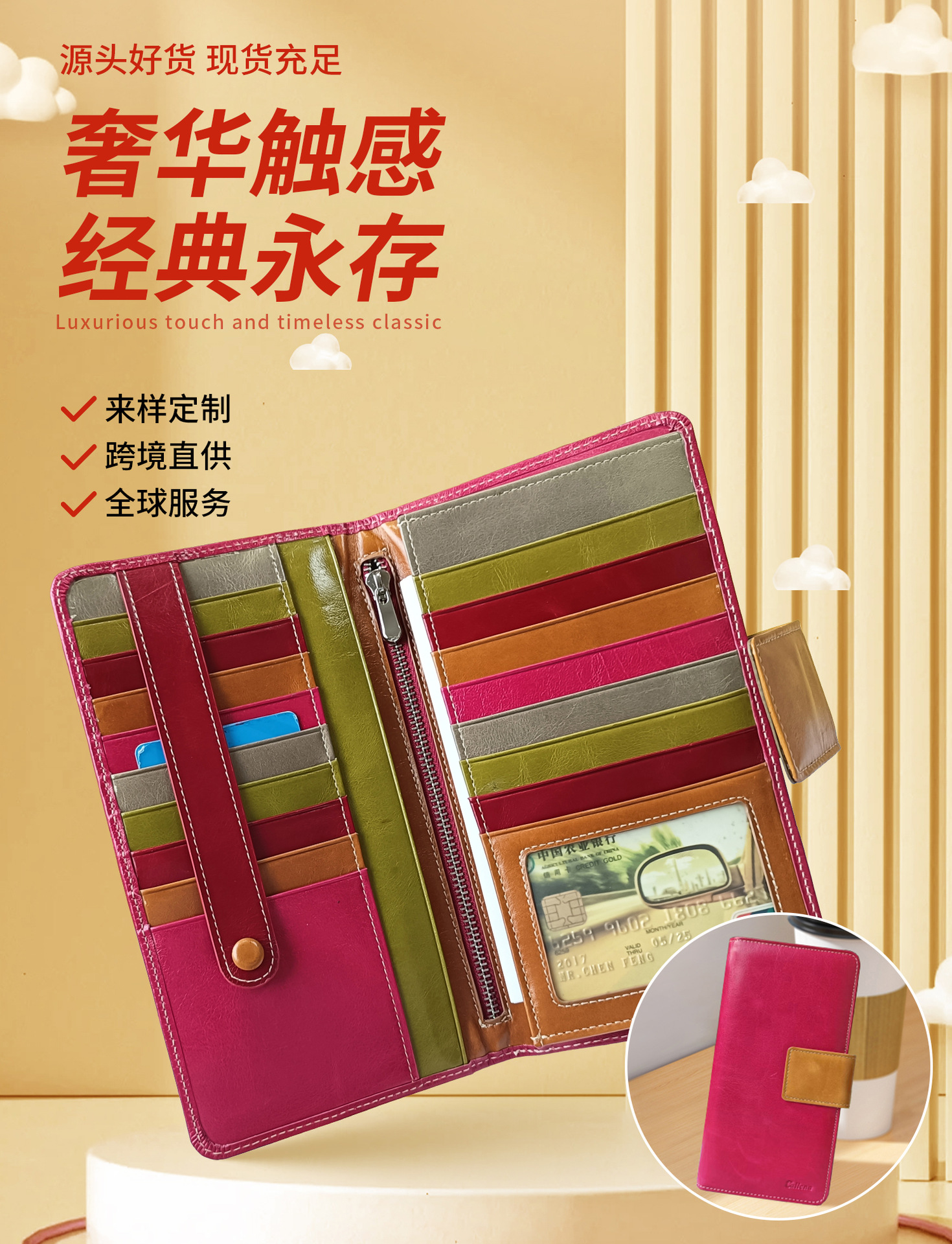 25年经验,专业真皮钱包代工定制工厂,可定制拿样。 现有刀模过百款, 现有模具支持小单定制。来图来样定制需要100个起订量。生产质量过硬,交期准时。量大优惠,专业客服提供咨询服务,欢迎咨询。